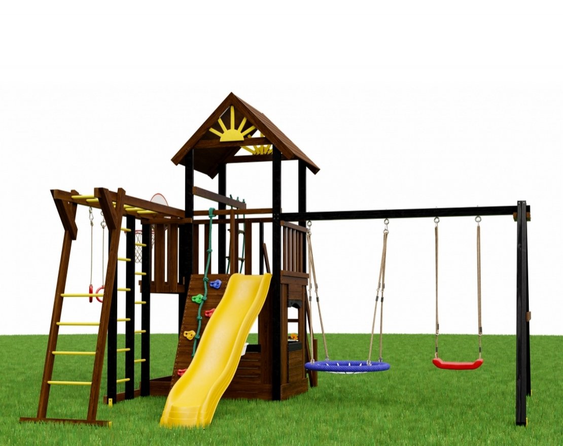 Игровая площадка Флорида 3 - залог гармоничного физического развития детей. Его комплектация расширена. Кроме шведской стенки, качелей, рукохода, горной стенки с канатом, она дополнена домиком на первом этаже башни и двумя цветочницами.