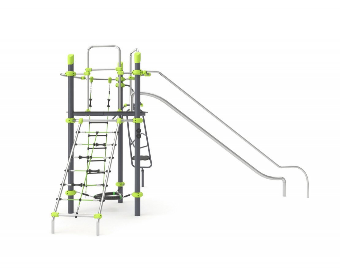 Комплекс оснащен канатными сетками, металлическими трубами-лазалками и пластиковыми уступами. На конструкции также установлена карусель-вертушка.