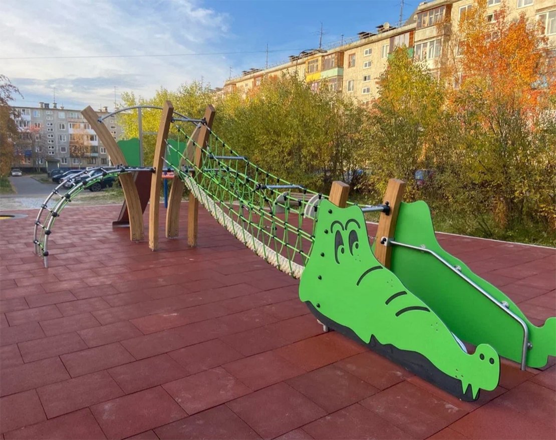 Состоит из опорных стоек, канатных сеток, пластиковых панелей и металлической горки с защитными бортиками.