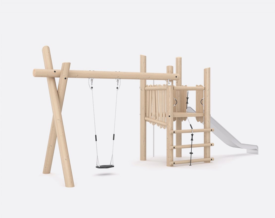 Состоит из опорных стоек, перекладин, металлической трубы-лазалки, открытой горки с защитными бортиками и качели на подвесах. Для большей безопасности, конструкция оснащена ручками-стропами.