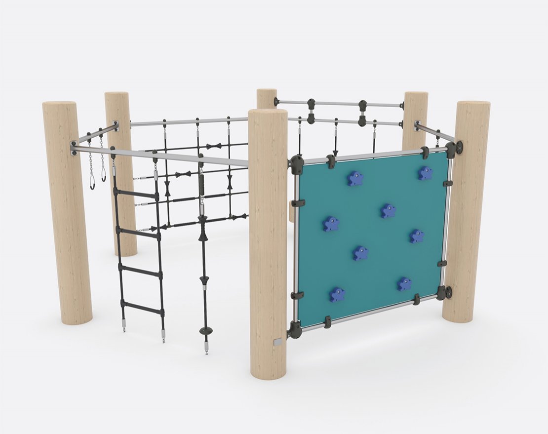 Состоит из опорных столбов, металлических перекладин, лестниц, скалодромной панели с зацепами и канатных строп с уступами.
