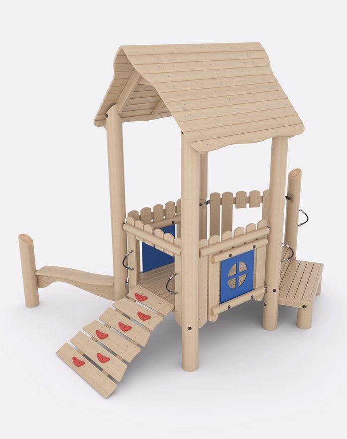 Представляет собой домик с крышей, перегородками, интерактивной панелью, скамейкой и малой открытой металлической горкой с защитными бортиками. Для большего комфорта, конструкция оснащена ручками-стропами.