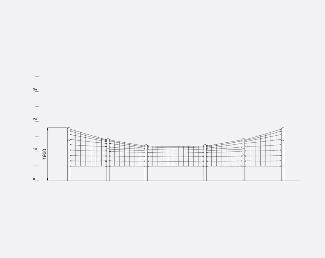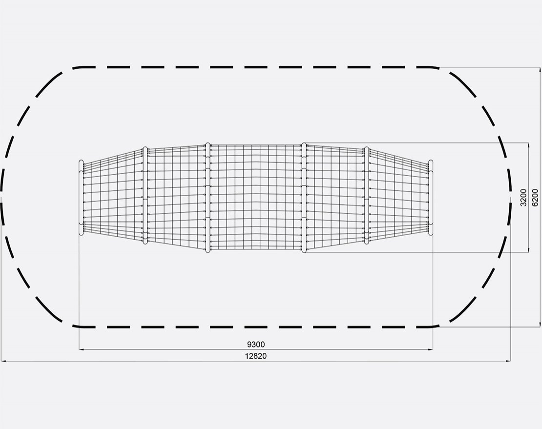 Канатная конструкция серии UFO. Выполнена из металлического каркаса и канатной сетки в виде тоннеля. Металлические трубы, образующие каркас, установлены на разной высоте и имеют разный уровень наклона. На конструкцию можно забираться или играть внутри. Предназначена для массовых игр.