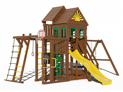 Хотите обеспечить детям безопасную активность на даче – купите детскую площадку Чарли 3. Здесь есть все, что необходимо для полноценного физического и умственного развития ребенка. Настоящий домик с окошками и цветочницей – основа для массы ролевых игр, разнообразные канатные и шведские стенки обеспечат выход физической активности, два варианта качелей подойдут и младенцам, и взрослым, а специальная доска позволяет рисовать мелом. Конструкция тщательно продумана, надежно закреплена и исключает вероятность травм. Карельская сосна износостойка, не боится погодных явлений, тщательно отшлифована и покрыта безопасной краской.