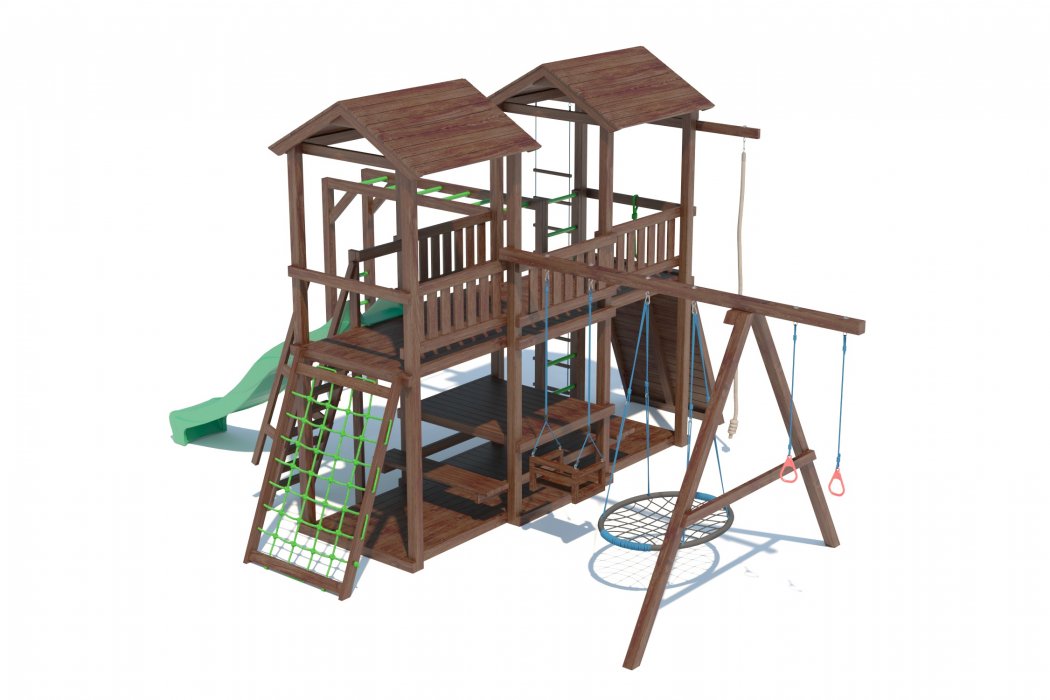 Основа детской игровой - спортивной конструкции – две башни с мостиком и игровой платформой. Конструкция оснащена двумя двускатными деревянными крышами, встроенным столиком с лавками и дополнительной платформой в нижней части конструкции, пластиковым волнообразным скатом с превосходной скользящей поверхностью, деревянной лестницей, широким скалодромом, канатной лестницей, деревянным рукоходом, шведской стенкой, приставными качелями, сидением качели «гнездо», сидением качели «малютка», гимнастическими кольцами, подвесной лестницей и гимнастическим канатом. Для безопасности ребенка предусмотрены перила на лестнице, заборчики и ограждения над зонами препятствий (скалодром, канатная лестница, скат).