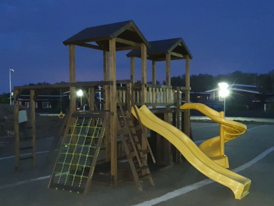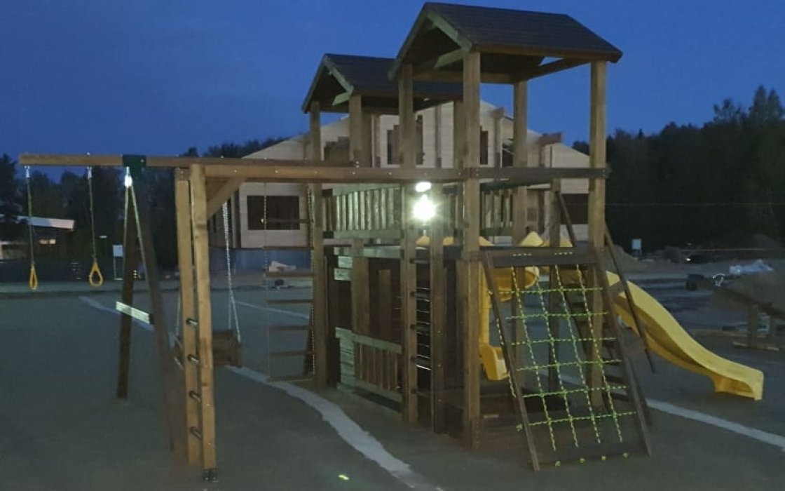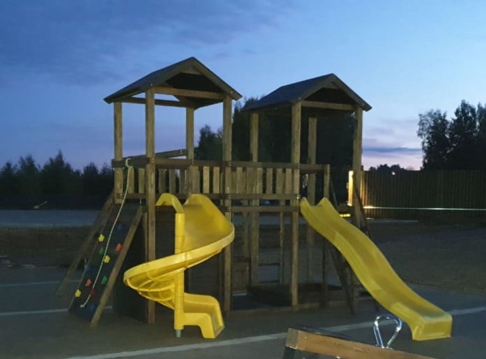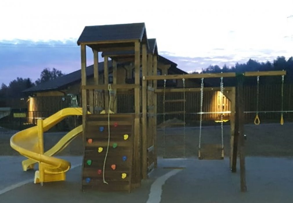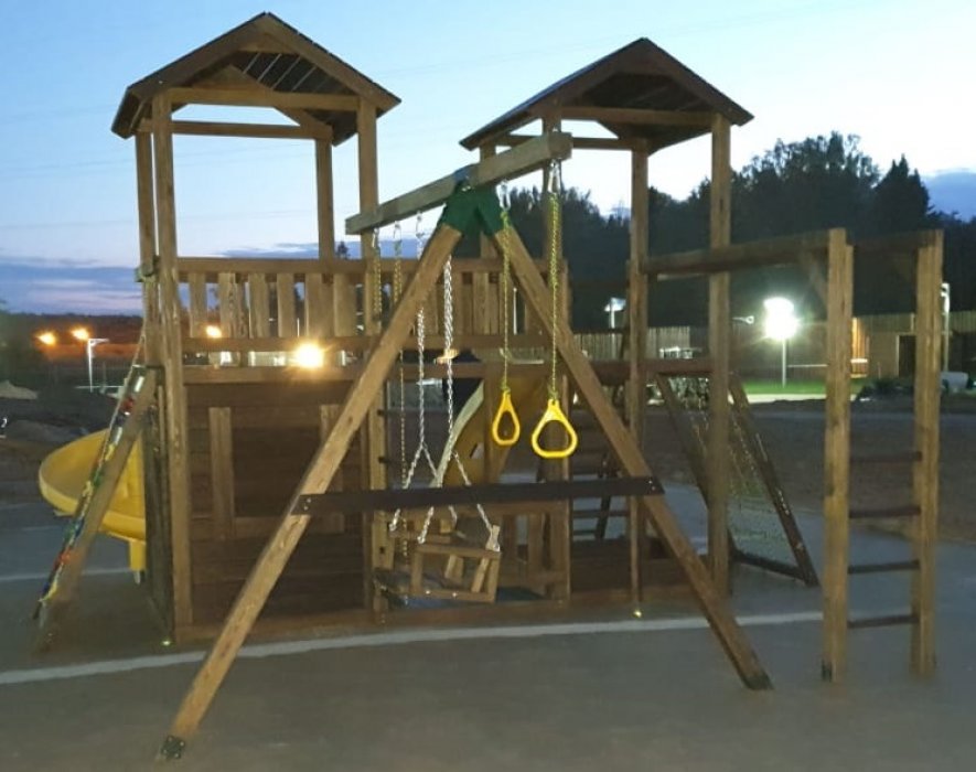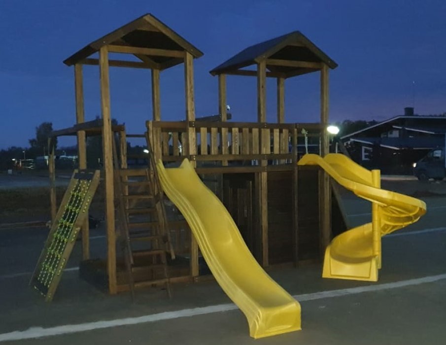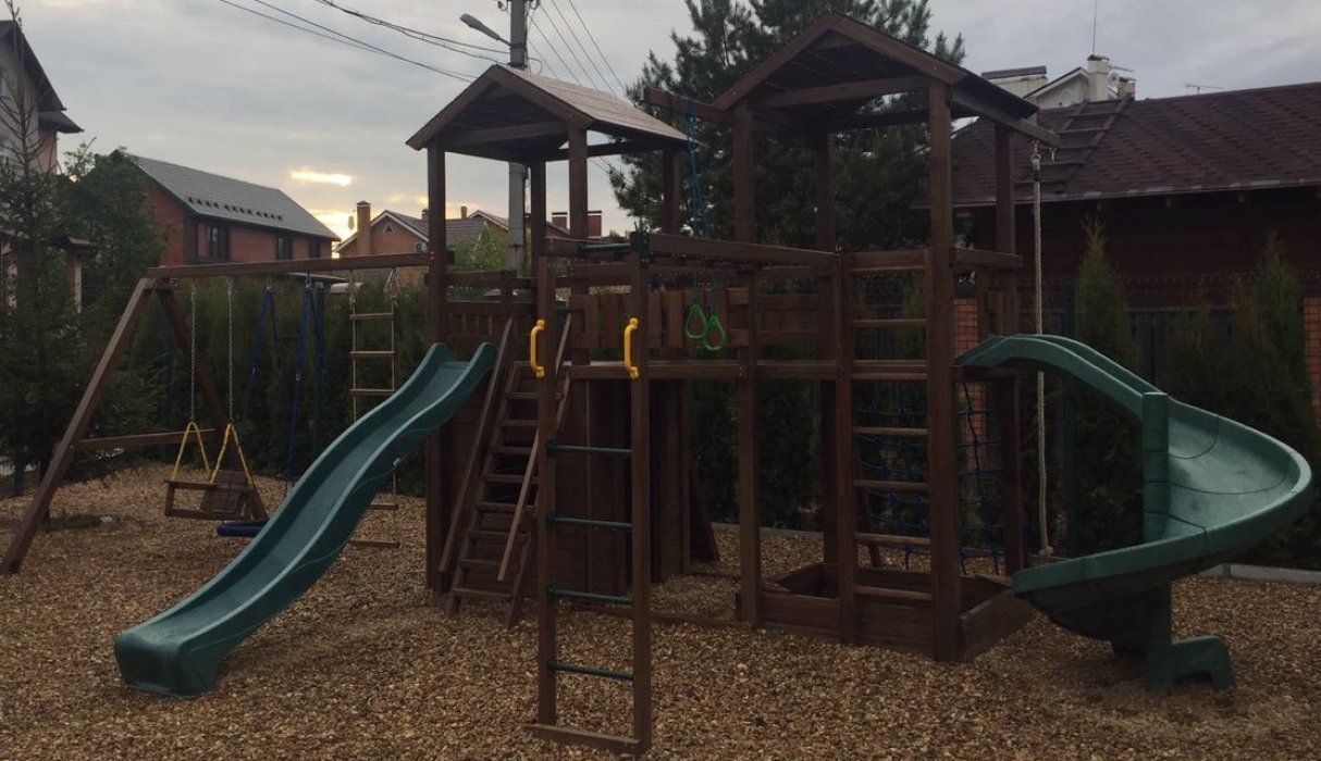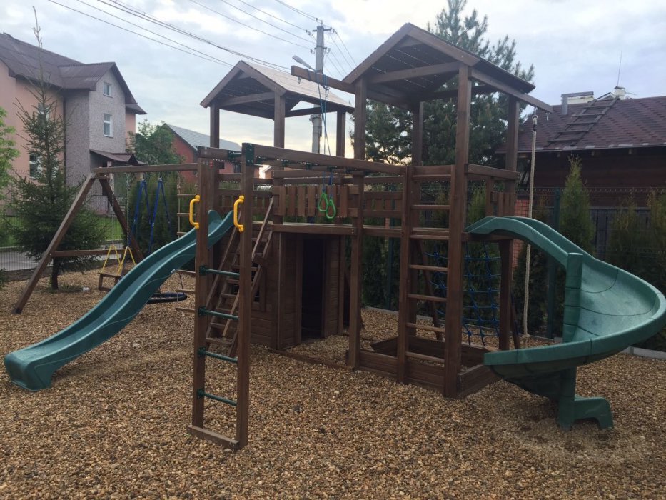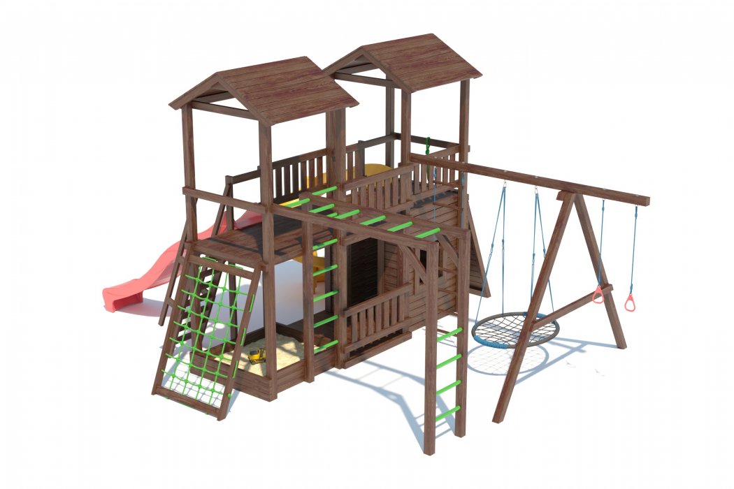 Основа детской игровой - спортивной конструкции – две башни с мостиком и игровой платформой. Конструкция оснащена двумя двускатными деревянными крышами, встроенным домиком, встроенной песочницей и дополнительной платформой в нижней части конструкции, пластиковыми волнообразным скатом и винтовым скатом с превосходной скользящей поверхностью, деревянной лестницей, широким скалодромом, канатной лестницей, деревянным рукоходом, шведской стенкой, приставными качелями, сидением качели «гнездо», гимнастическими кольцами и подвесной лестницей. Для безопасности ребенка предусмотрены перила на лестнице, заборчики и ограждения над зонами препятствий (скалодром, канатная лестница, скат).