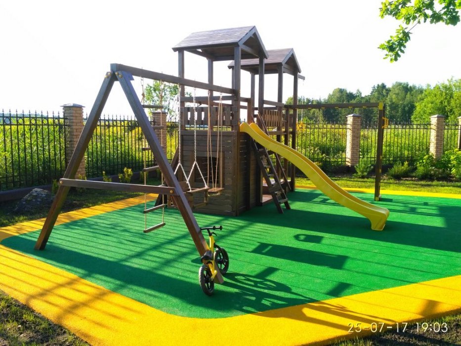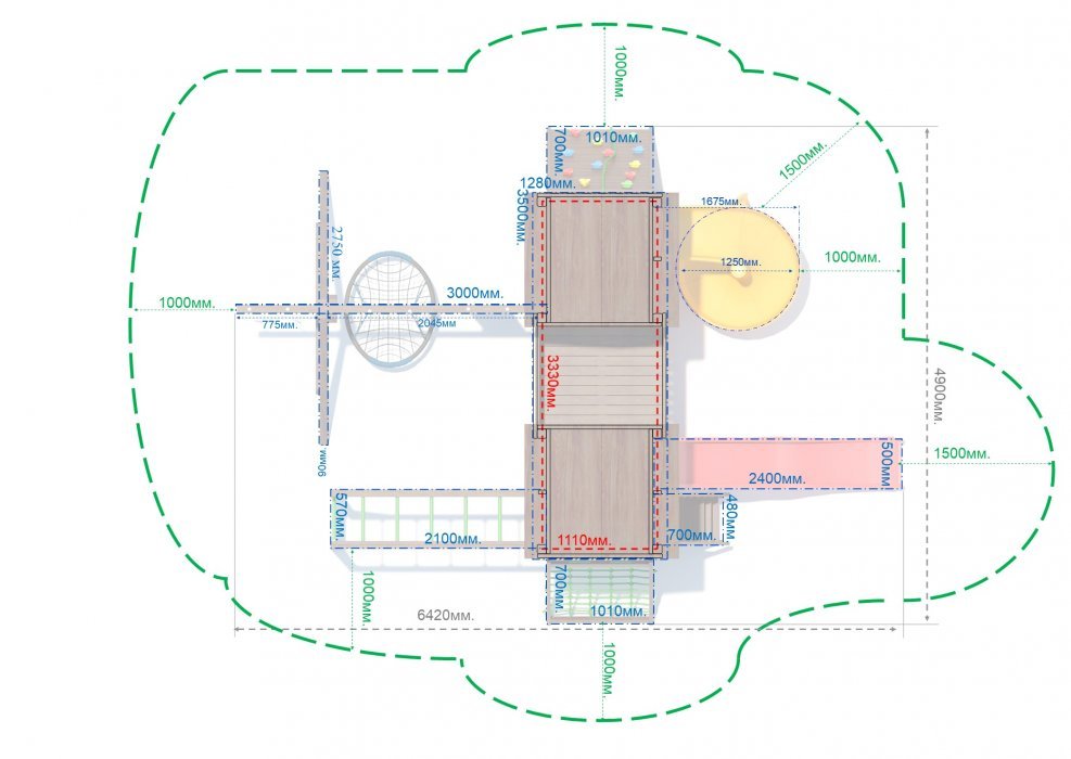 Площадь поверхности детской площадки = габариты конструкции по крайним точкам + 1000/1500мм. по периметру конструкции. Поверхность должна быть твердой, ровной, свободной от насаждений, горизонтальной без перепадов, допустимый уклон не более 20мм. на 10п.м.