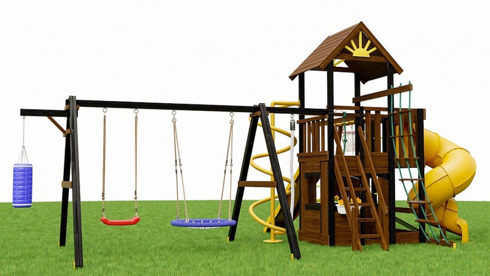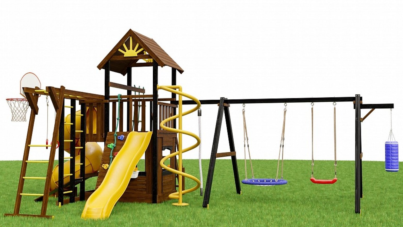 Качели «Гнездо» и прямые качели рассчитаны на серьёзную нагрузку. А баскетбольное кольцо — дополнительный стимул для командных игр всей семьёй.