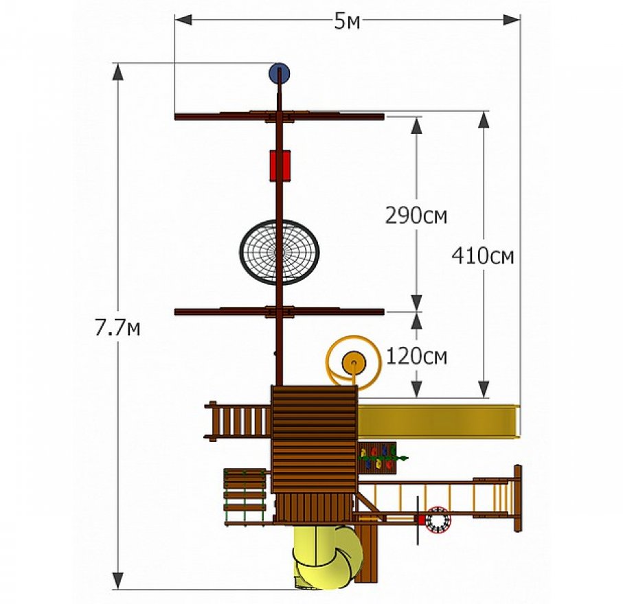 В комплексе всё, что нужно детям: шведская стенка, рукоход, верёвочная лестница, небольшой турник, стенка для скалолазания с яркими зацепами и канатом. Пара горок — классическая и «Труба» — обеспечивают безопасный и весёлый спуск.