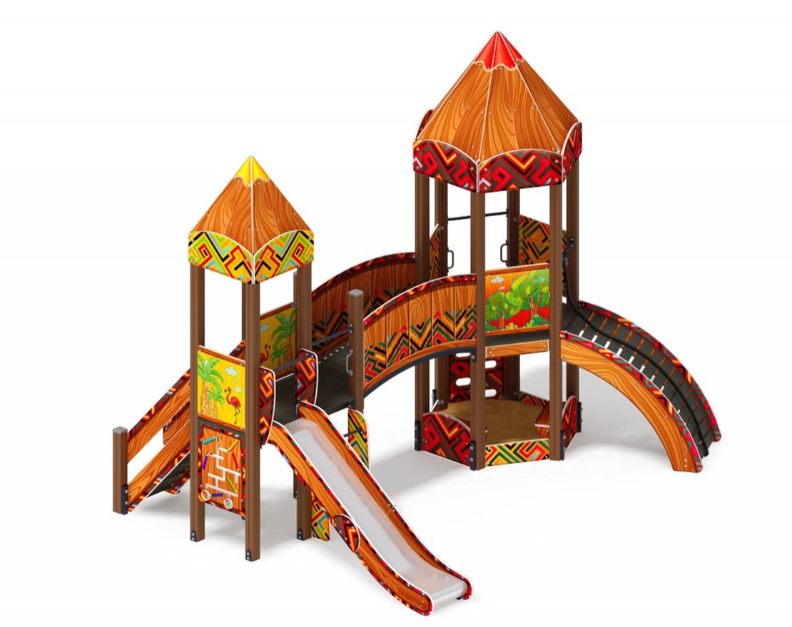 Спаренная башня из шести клеёных брусьев 100х100 мм высота 3000 мм-4 шт. и 2200 мм- 2 шт.; полы из ламинированной фанеры, с анти-скользящим покрытием 1460х780мм толщиной 18мм. Башня состоит из двух частей, над частью с горкой имеется четырёхскатная крыша из фанеры толщиной 12 мм, кромки фанеры тщательно шлифованы, фанера окрашена с нанесением принта. Башня украшена стилизованными декоративными арками (780х380х18мм) и четырехскатной крышей, крыша поставляется в сборе и выполнена из влагостойкой фанеры толщиной 12 мм (габариты в сборе 770х770х740мм), кромки фанеры тщательно шлифованы, окрашены с нанесением принта. Отметка пола башни от планировочной отметки площадки 1200мм. Высота башни 3740 мм.
