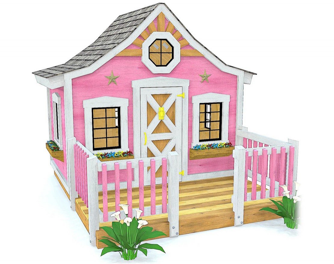 Розовый игровой домик для девочек с широкой крышей предлагает относительно простую конструкцию, минимальные затраты на строительные материалы, а также массу сказочных ощущений и очарования.