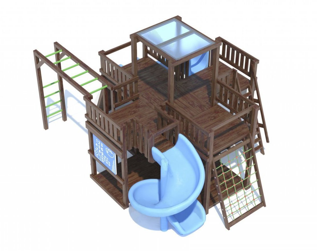 Основа детской игровой - спортивной конструкции – башня и четыре балкона «серия F». Конструкция оснащена плоской прозрачной крышей, встроенным полом, встроенным столиком с лавками в нижней части конструкции, пластиковым антивандальным скатом с превосходной скользящей поверхностью, антивандальным винтовым скатом с переходным мостиком, «П»-образным деревянным рукоходом, скалодромом, канатной лестницей с армированным канатом, деревянной лестницей, антивандальными пластиковыми игровыми панелями. Для безопасности ребенка предусмотрены перила на лестнице, заборчики и ограждения над зонами препятствий (скат).