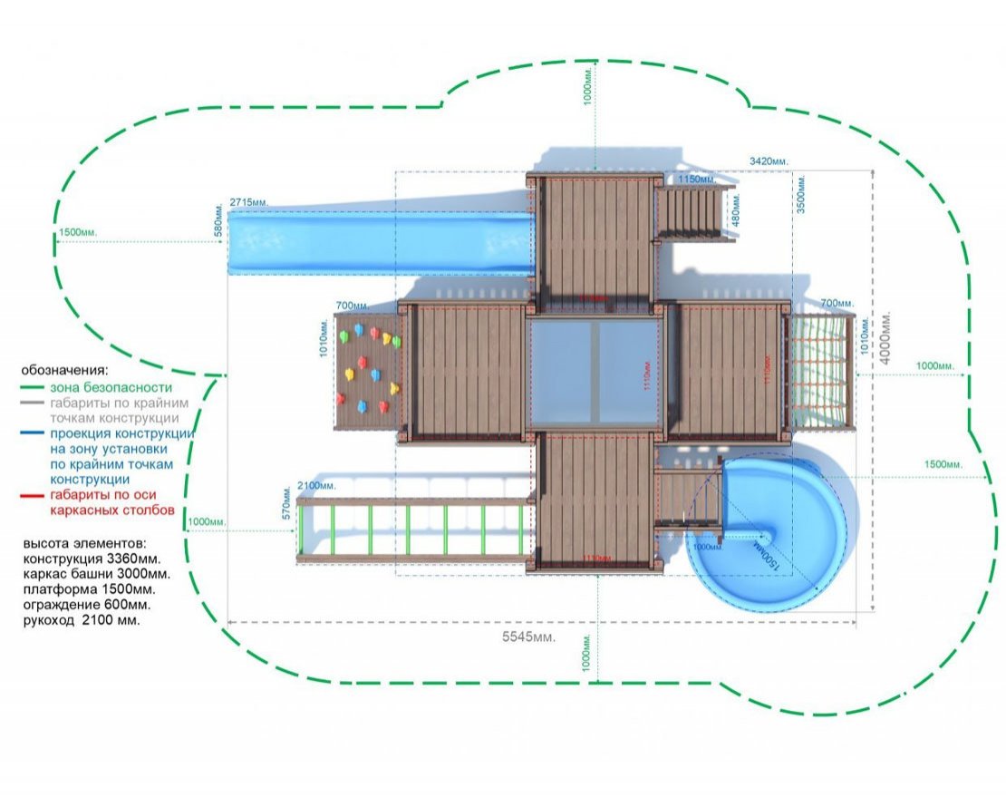 Габариты площадки для установки конструкции с учетом зоны безопасности: 8545х7000мм. (длина/ширина); S-59,8м².