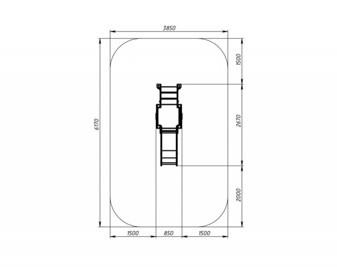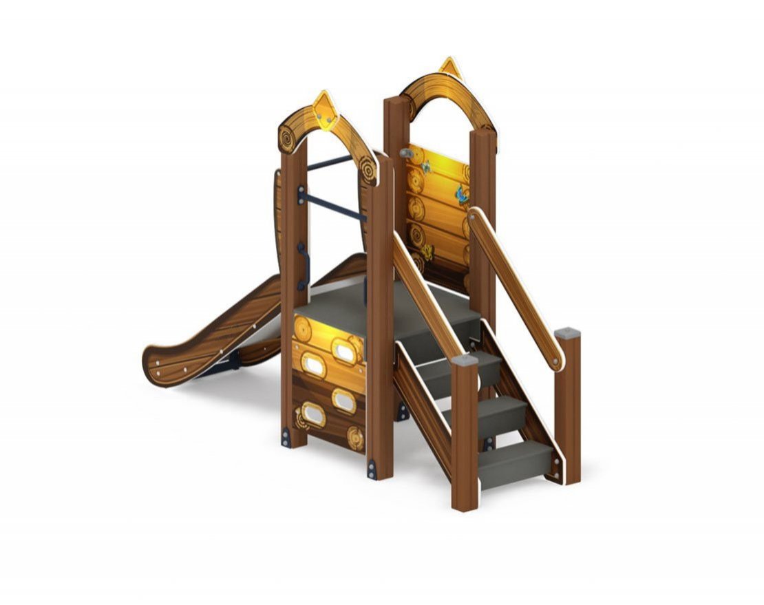 Лестница состоит из бортов, выполненных из фанеры влагостойкой толщиной 24 мм, и трех ступенек, выполненных из ламинированной анти- скользящей фанеры, толщиной 18 мм, ширина ступней 560 мм. Пространство между ступенями закрыто экранами из влагостойкой фанеры толщиной 18 мм, между ступенью и экраном имеется щель для слива дождевой воды. Ступени и экраны вставляются в пазы бортов лестницы. Борта стягиваются тремя шпильками диаметром 10 мм. Лестница поставляется в собранном виде. Лестница крепятся к двум брусьям башни и двум клееным брусьям 100х100 мм, брус окрашен в коричневый цвет, высота 800 мм (2 шт).
