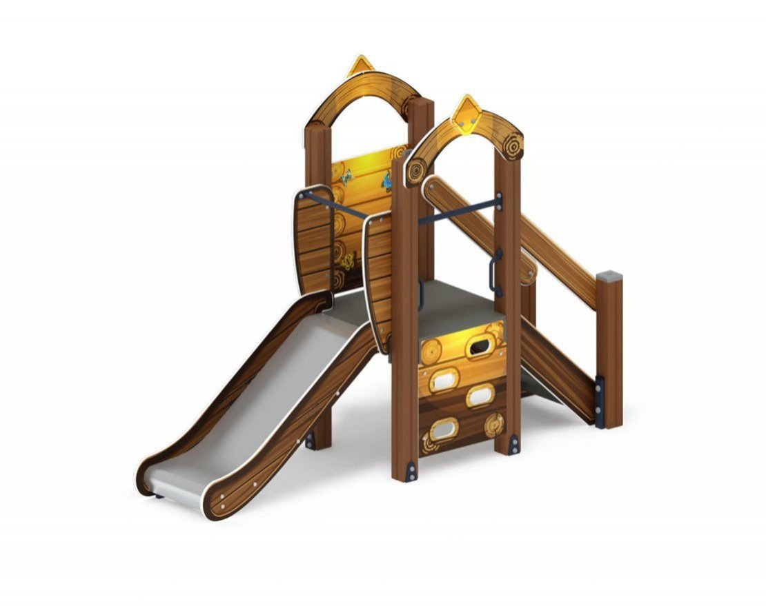 Выполнена из четырёх клеёных брусьев, окрашенных в коричневый цвет, сечением 100х100 мм и высота 1700 мм. Пол из ламинированной фанеры с анти-скользящим покрытием размером 780х780 мм толщиной 18 мм. Башня без крыши. Кромки фанеры тщательно шлифованы. Отметка пола башен от планировочной отметки площадки 750 мм.