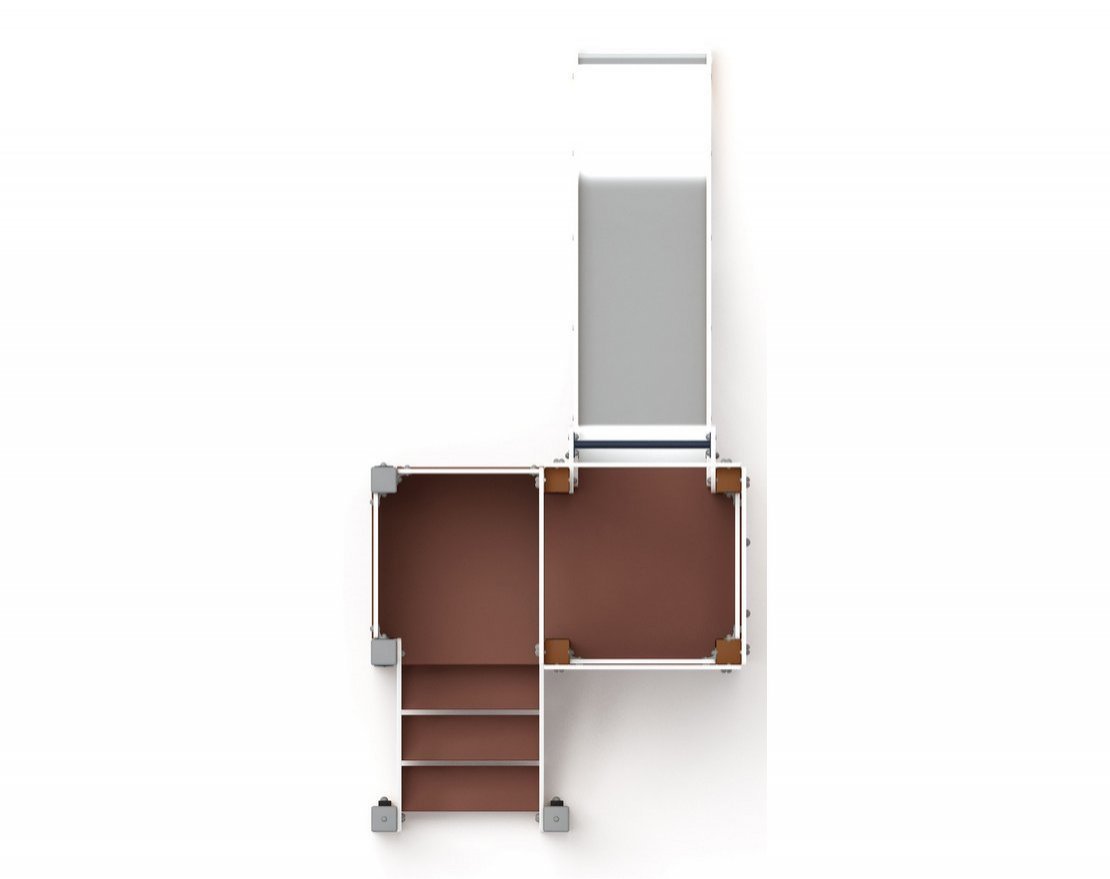 Лестница состоит из бортов, выполненных из влагостойкой фанеры толщиной 24 мм и трёх ступенек, выполненных из ламинированной антискользящей фанеры толщиной 18 мм, ширина ступней 560 мм. Пространство между ступенями закрыто экранами из влагостойкой фанеры толщиной 18 мм, между ступенью и экраном имеется щель для слива дождевой воды. Ступени и экраны вставляются в пазы бортов лестницы. Борта стягиваются шпильками диаметром 10 мм. Кромки фанеры тщательно шлифованы, борта окрашены при помощи УФ-печати. Лестница монтируется к брусу башни и на входе к двум клеёным брусам 100х100 мм высотой 800 мм, брус окрашен в коричневый цвет. Лестница поставляется в собранном виде.