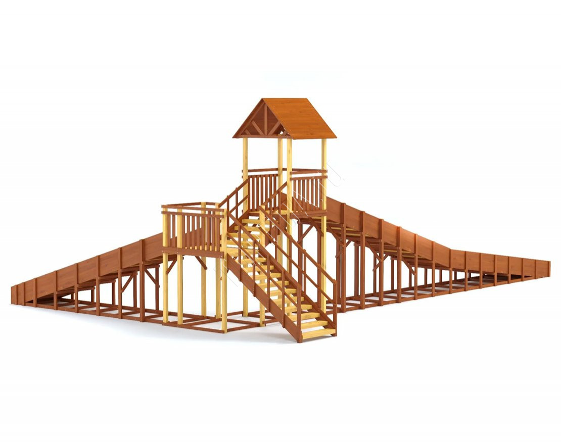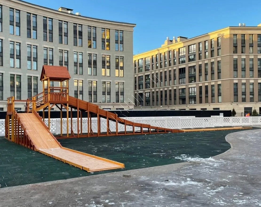 Зимняя горка сделана из качественного клееного бруса – это экологичный, долговечный и прочный материал с красивой древесной фактурой. Конструкция получается устойчивой и удобной, а для большей прочности поверхность покрывается специальным лакокрасочным составом, который повышает стойкость к внешним воздействиям. Покрытие имеет разрешающий сертификат для использования на детских площадках.