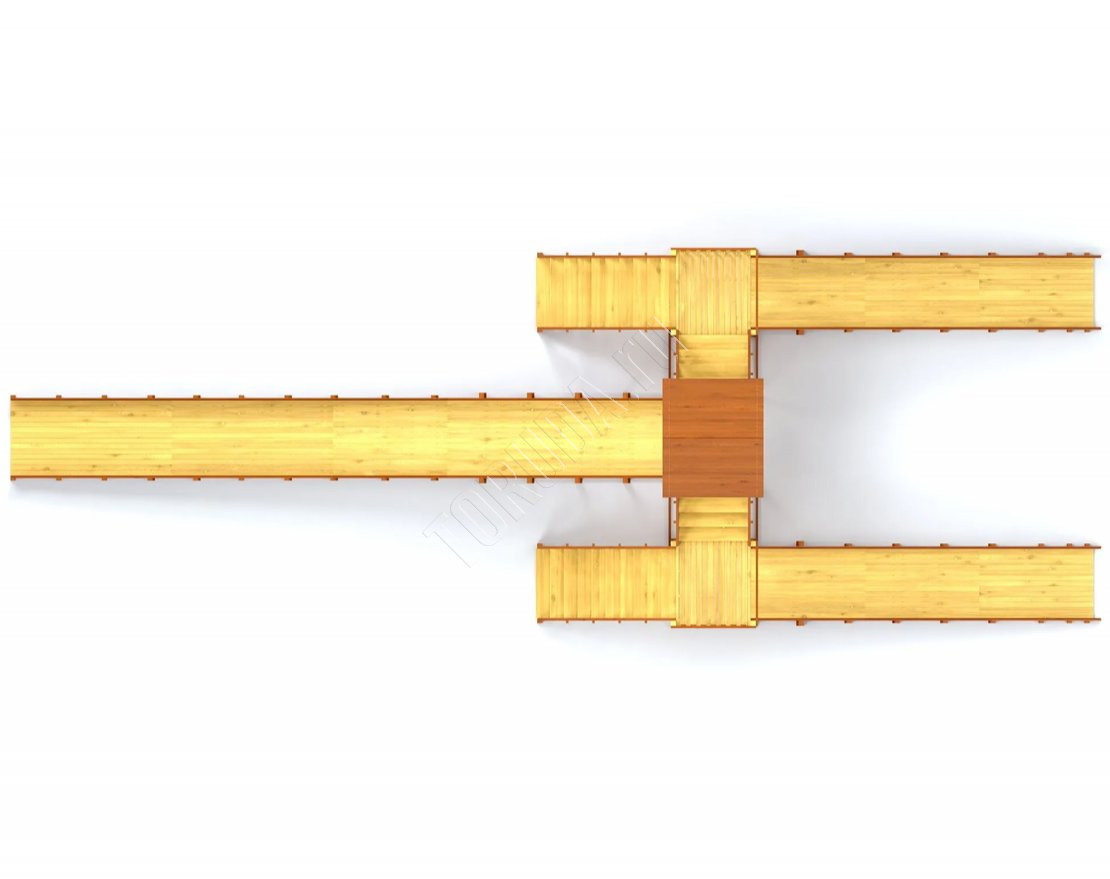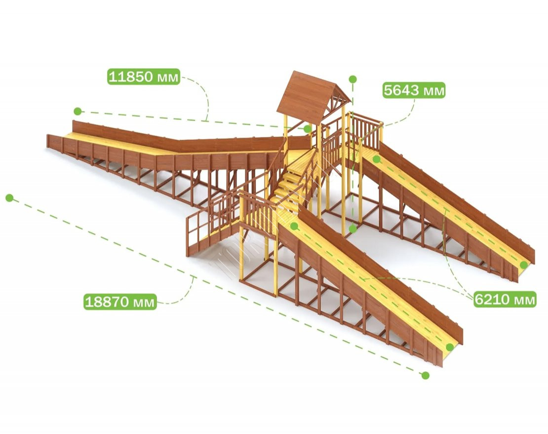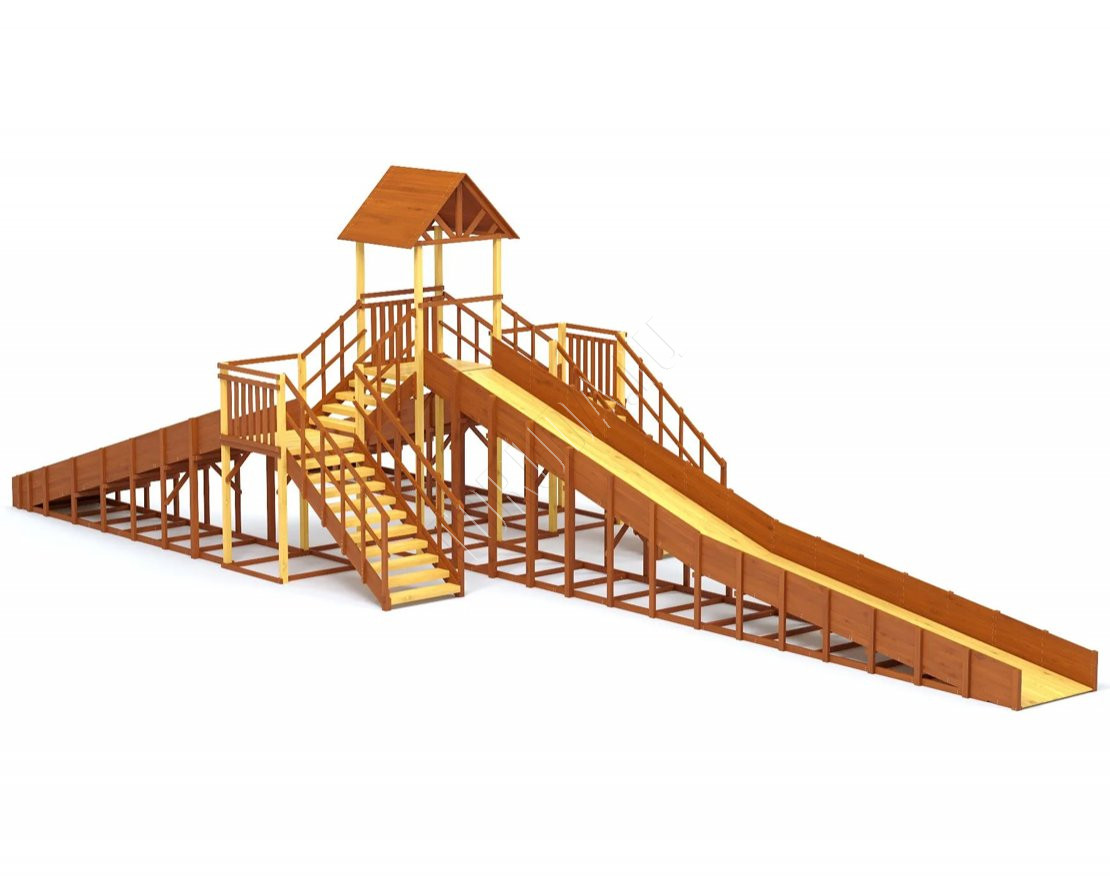 Конструкция тщательно спроектирована и выполнена из качественных материалов, что гарантирует безопасность и долгий срок службы. Каркас изготовлен из надежного клееного бруса, а в качестве защитного покрытия использован лакокрасочный состав с разрешающим сертификатом для применения на детских площадках.