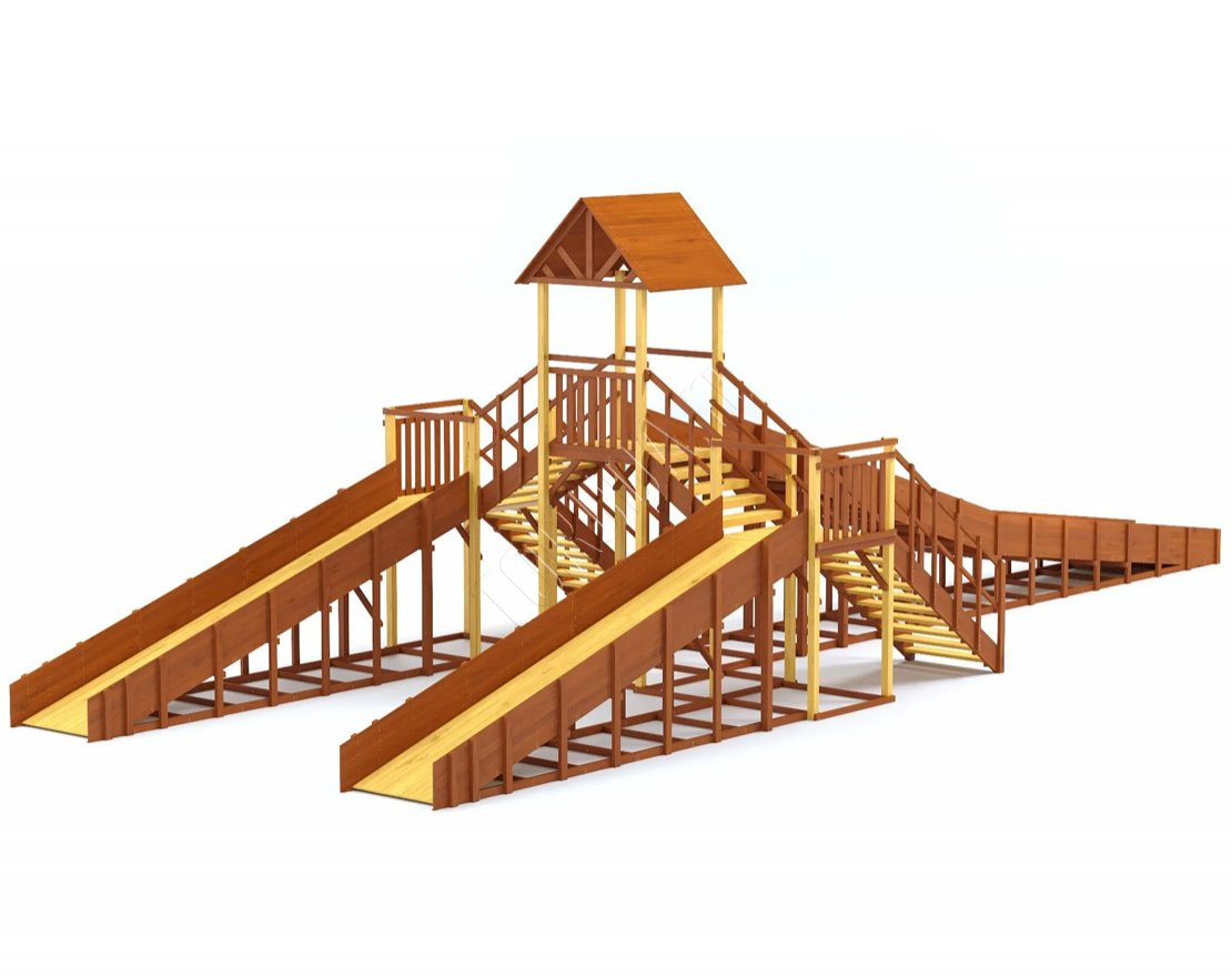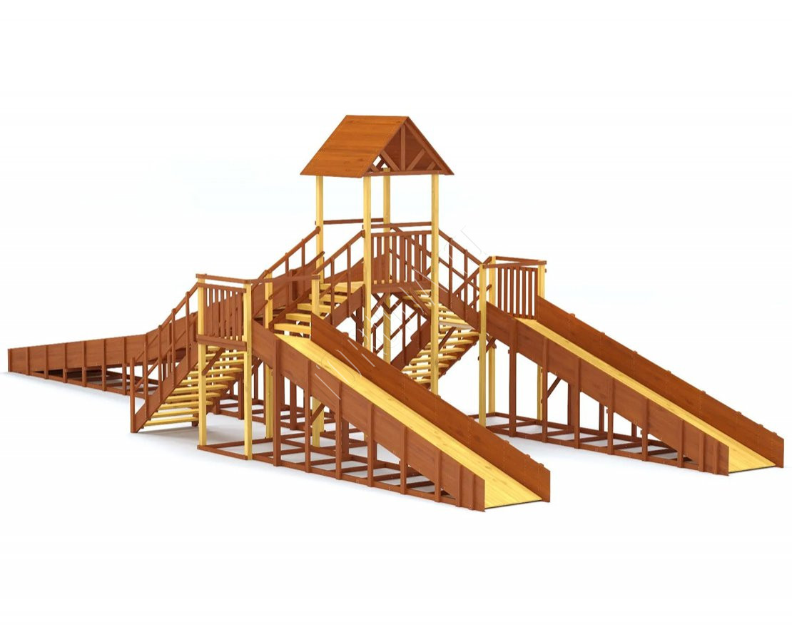 При изготовлении конструкций уделяется особое внимание безопасности всех элементов: углы скруглены и поверхности тщательно отшлифованы. Лесенки, перила и страховочные ограждения продуманы с точки зрения безопасности и удобства для детей.