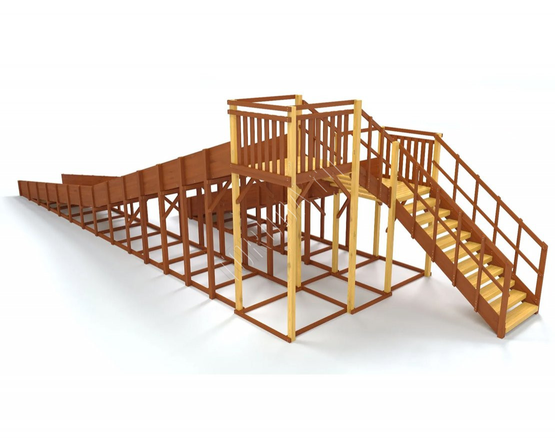 Каркас модели сделан из надежного клееного бруса, который отлично выдерживает любые погодные условия, сохраняя безупречную геометрию на протяжении многих лет. Поверхность дополнительно защищена от осадков экологичным лакокрасочным покрытием с разрешающим сертификатом, допускающим применение состава для детских комплексов.
