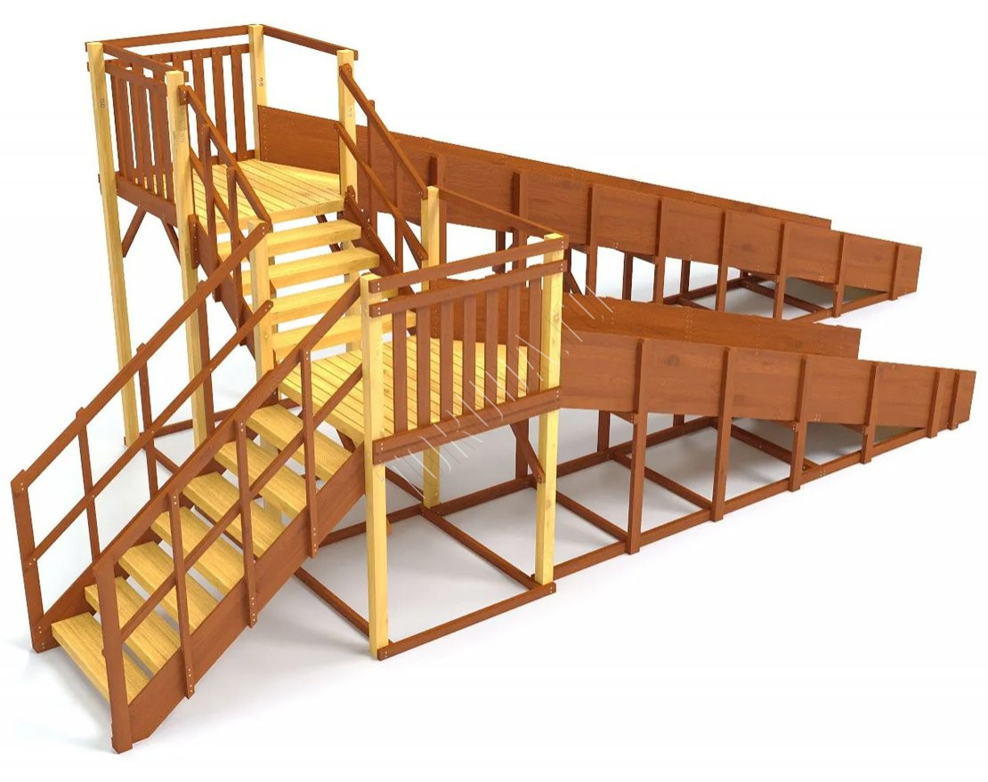 Большое внимание уделено деталям: углы имеют скругления, болты и другие крепежные элементы спрятаны под заглушками. Продуманная конструкция ступеней, высокие перила и страховочные ограждения делают наши площадки удобными и безопасными.