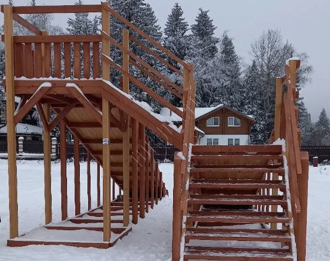 Конструкция разработана и произведена по ГОСТ. Каркас, воспринимающий нагрузку, сделан из клееного бруса и обработан сертифицированным лакокрасочным покрытием. Часть элементов окрашивается в светлый оттенок, а часть в темный.