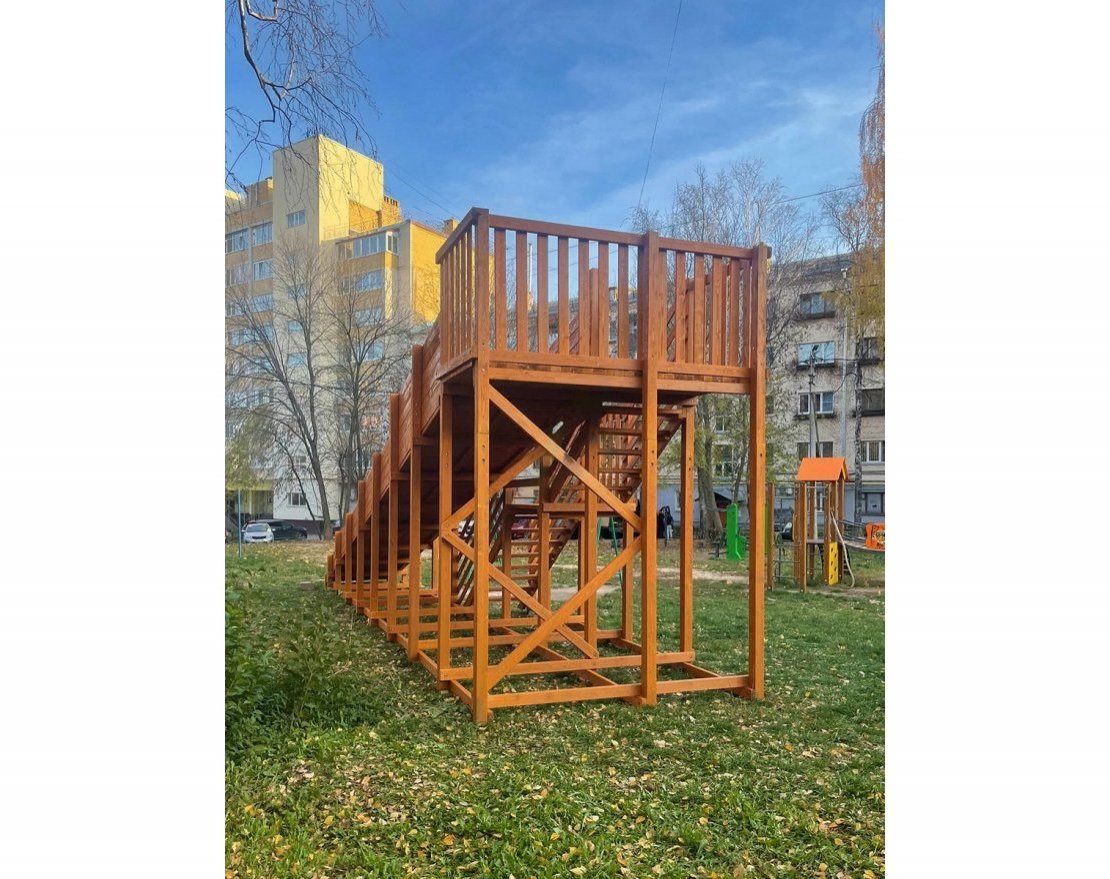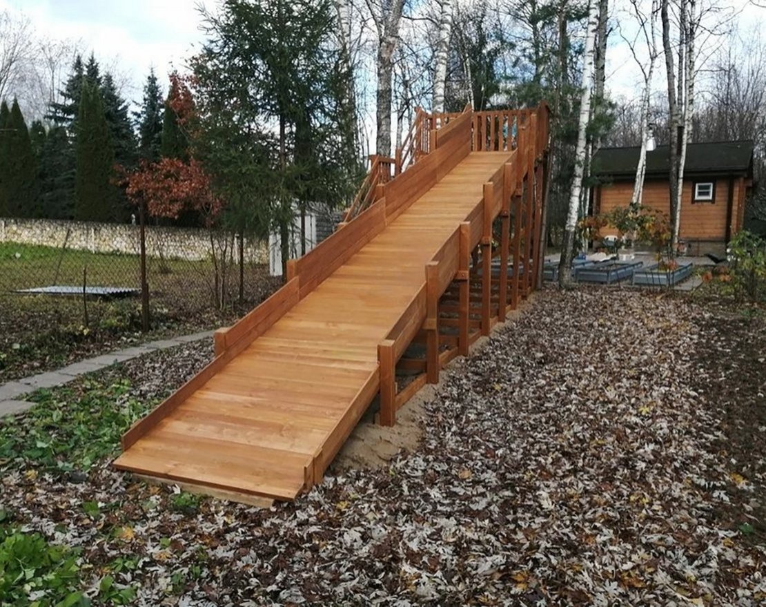 Модуль имеет приятный дизайн, который представлен в виде тёплого цветового оформления. Несущее изделие можно установить в общественном парке, возле частного дома, многоэтажек. Ведь благодаря тому, что лестница и скат располагаются перпендикулярно друг к другу, модуль не занимает лишнее место.