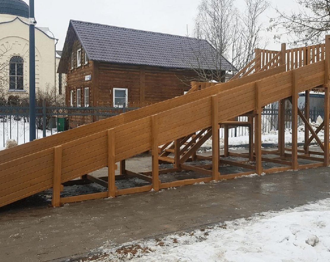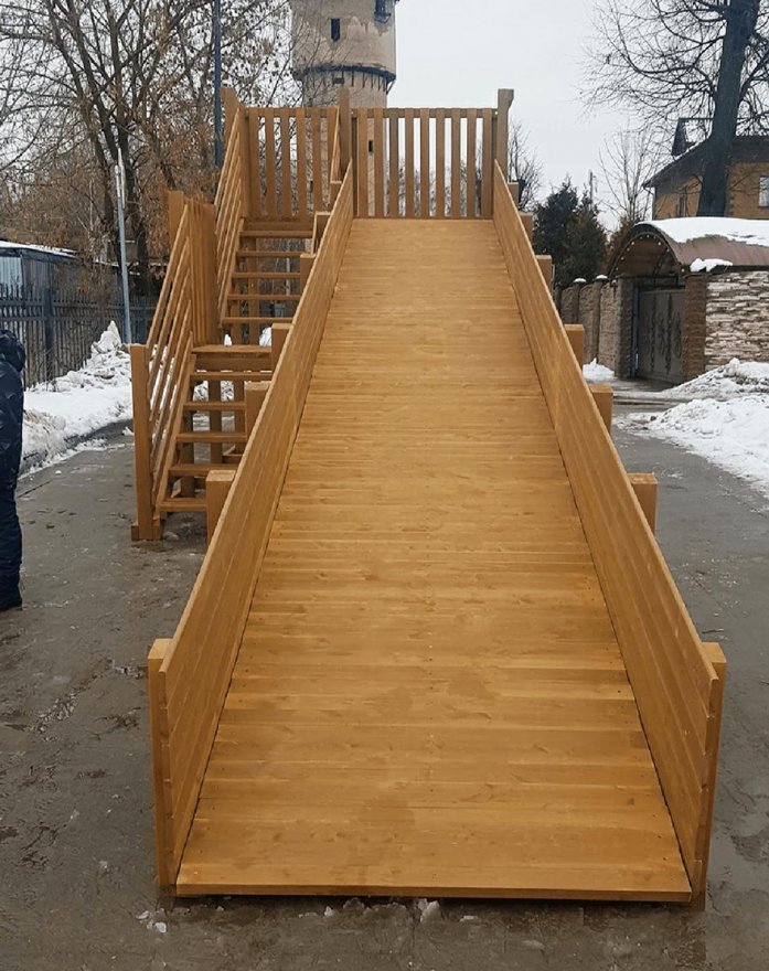 Для подъёма вверх конструкция оснащена лестницей и перилами. Рекомендуется каждый день очищать ступеньки от снега, чтобы на них не натаптывались ледышки, подвергающие детей опасности.