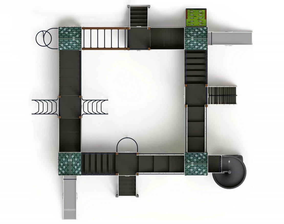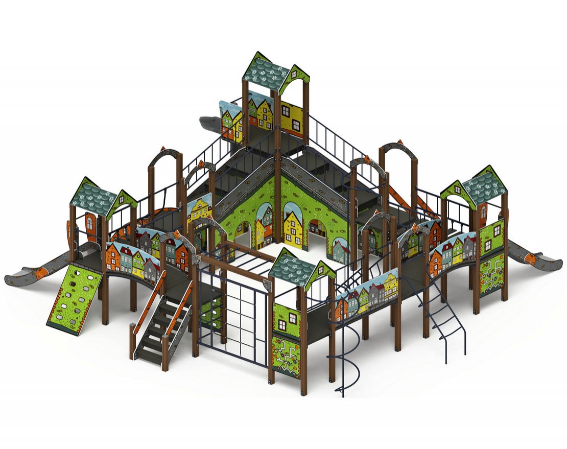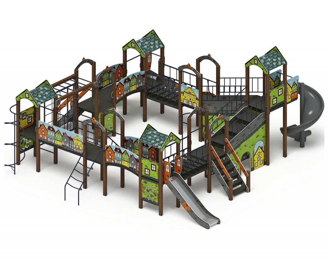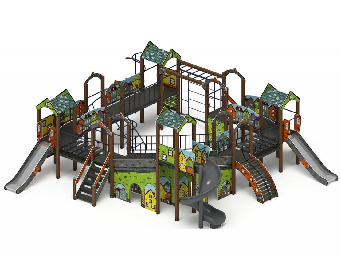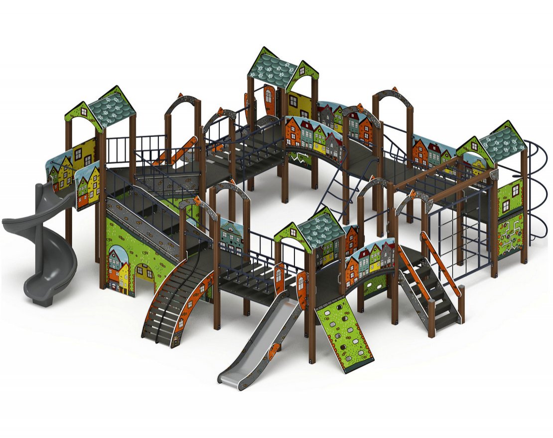 • Особенности комплектации: канат, рукоход, гладиаторская сетка, горка, скалодром, лестница, винтовая горка, спираль, лаз, мост, игровая панель, лаз-дуга, скалолаз