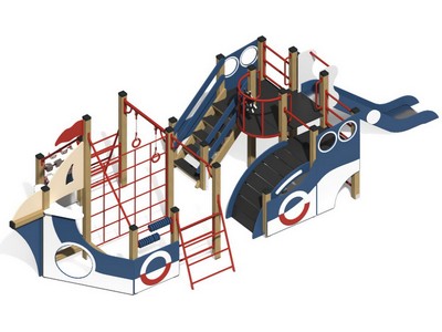 Игровой комплекс представляет собой модульную тематическую конструкцию в стиле «Корабль», состоящую из: двадцати одного опорного столба на металлических оцинкованных опора-подпяниках, трех разноуровневых площадок из влагостойкой ламинированной противоскользящей фанеры с металлическими ручками, одного ската горки с бортами, ограждениями и турником, одного лестничного марша с перилами, одного дугового снаряда «Трап» со ступенями из ламинированной противоскользящей фанеры, металлического балкона с крутящимся штурвалом, двух металлических наклонных гимнастических стенок, одной металлической сетки, одного металлического турника с усилениями, двух гимнастических колец на усиленном турнике, одного набора деревянных кубиков для игры в «крестики - нолики». Двух наклонных металлических распорок к центральному столбу - «мачте», трех горизонтальных деревянных брусьев, играющих роль скамеек, одного фанерного флага на центральной башне, двух «парусов», один из которых имеет сквозные прорези, одной носовой части, двух вертикальных металлических гимнастических стенок, восьми фанерных бортов со сквозными круглыми «окнами» и декоративными накладками «спасательный круг».