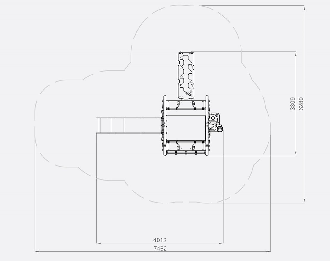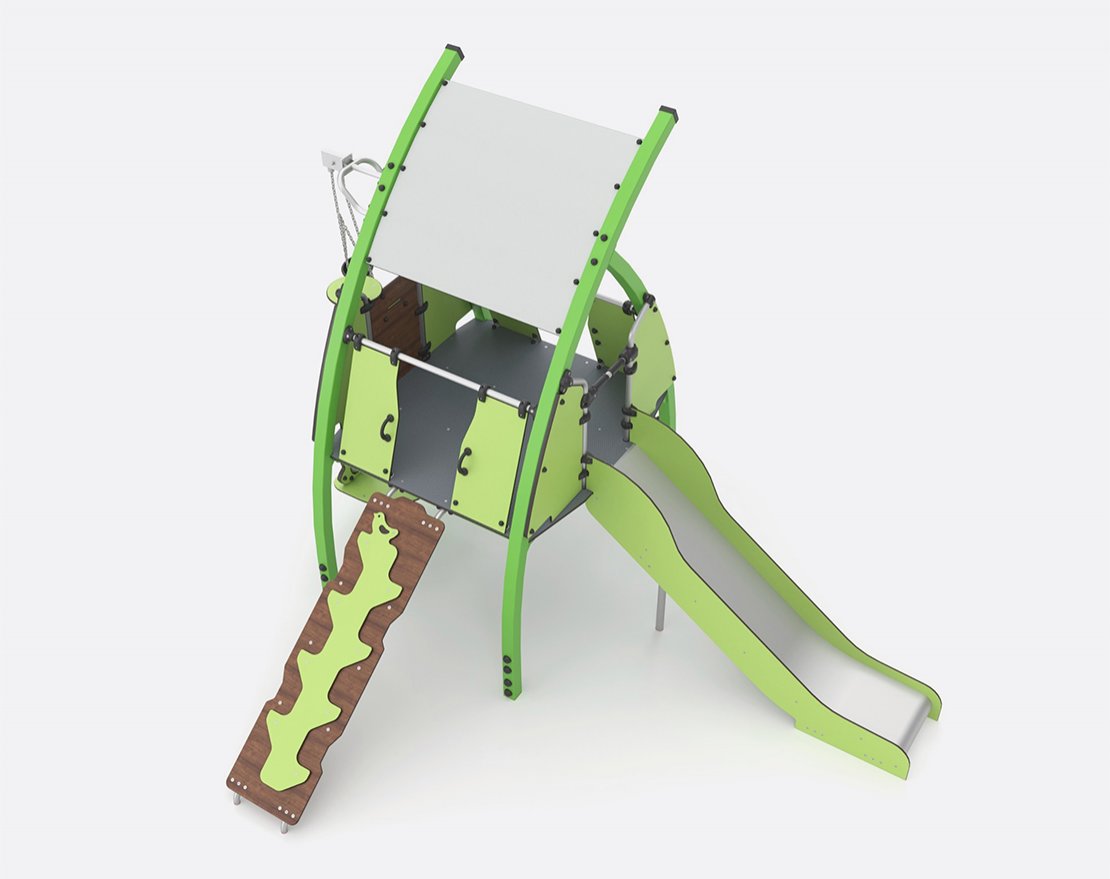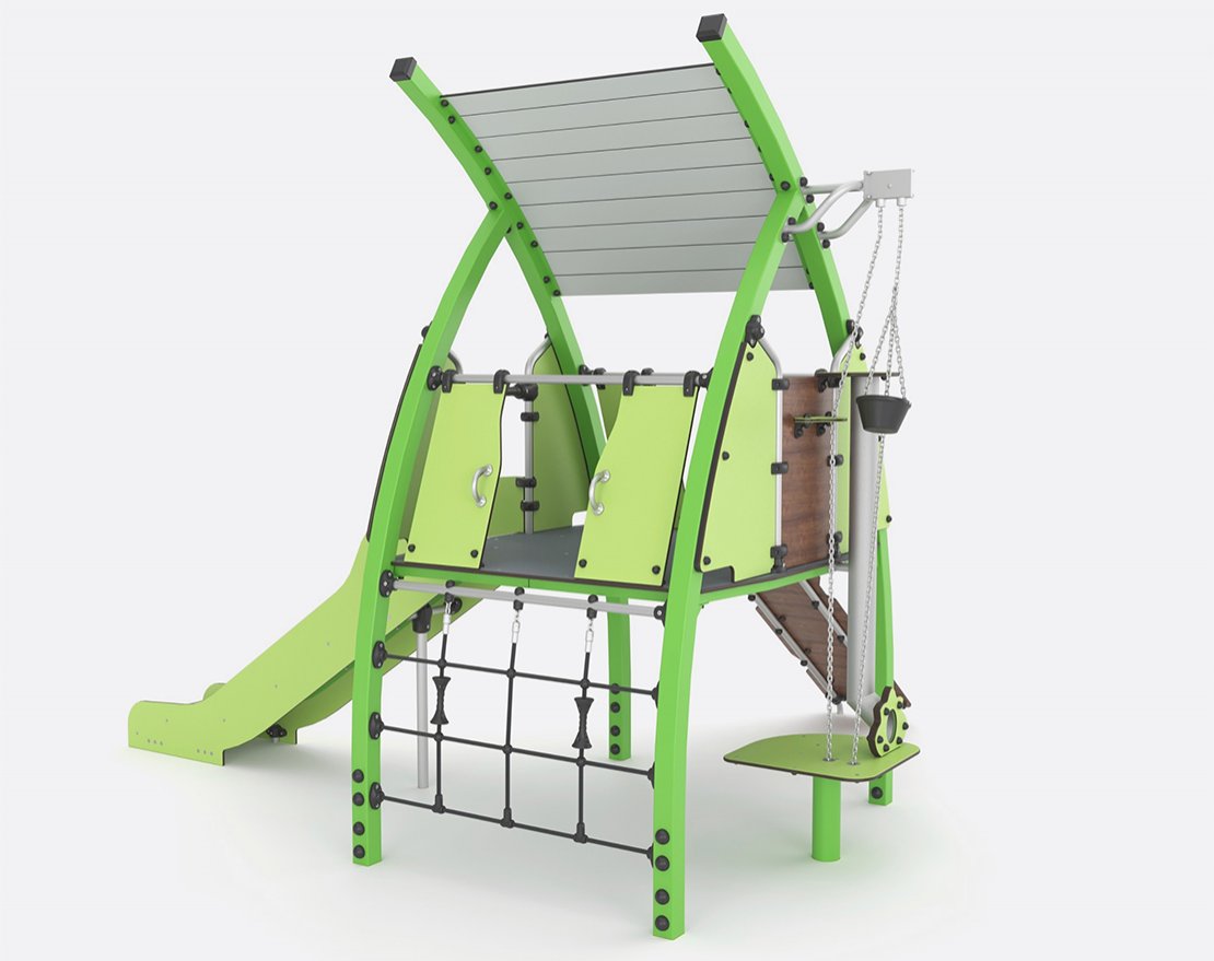 Игровая конструкция серии Lago. Устанавливается на детских уличных площадках. Состоит из канатной сетки, металлической горки с пластиковыми защитными бортиками, пандуса и игровых элементов. Все крепежные элементы закрыты составными защитными колпачками и заглушками.