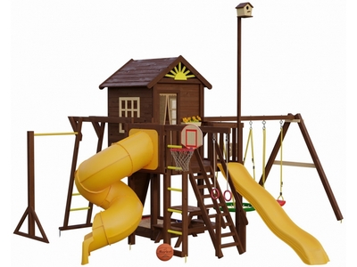 На втором этаже игровой площадки расположился большой просторный домик размером 126х145см. Данная премиальная модель обеспечивает разнообразные игровые модули, такие как турник, шведская стенка, горка «труба», гимнастические кольца, рукоход, задний лаз в домик и многое другое.