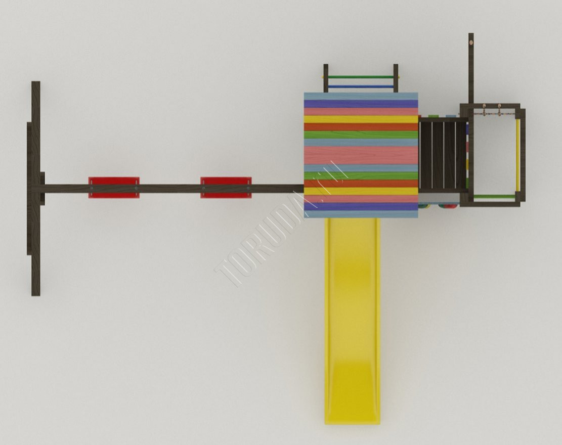 - Центром является башня с платформой на высоте 1.2 м, забраться на которую можно по наклонной или отвесной лестнице с металлическими перекладинами, либо по скалодрому. Башня имеет деревянную крышу и расширенный балкон. Спуститься вниз здорово по яркой горке.