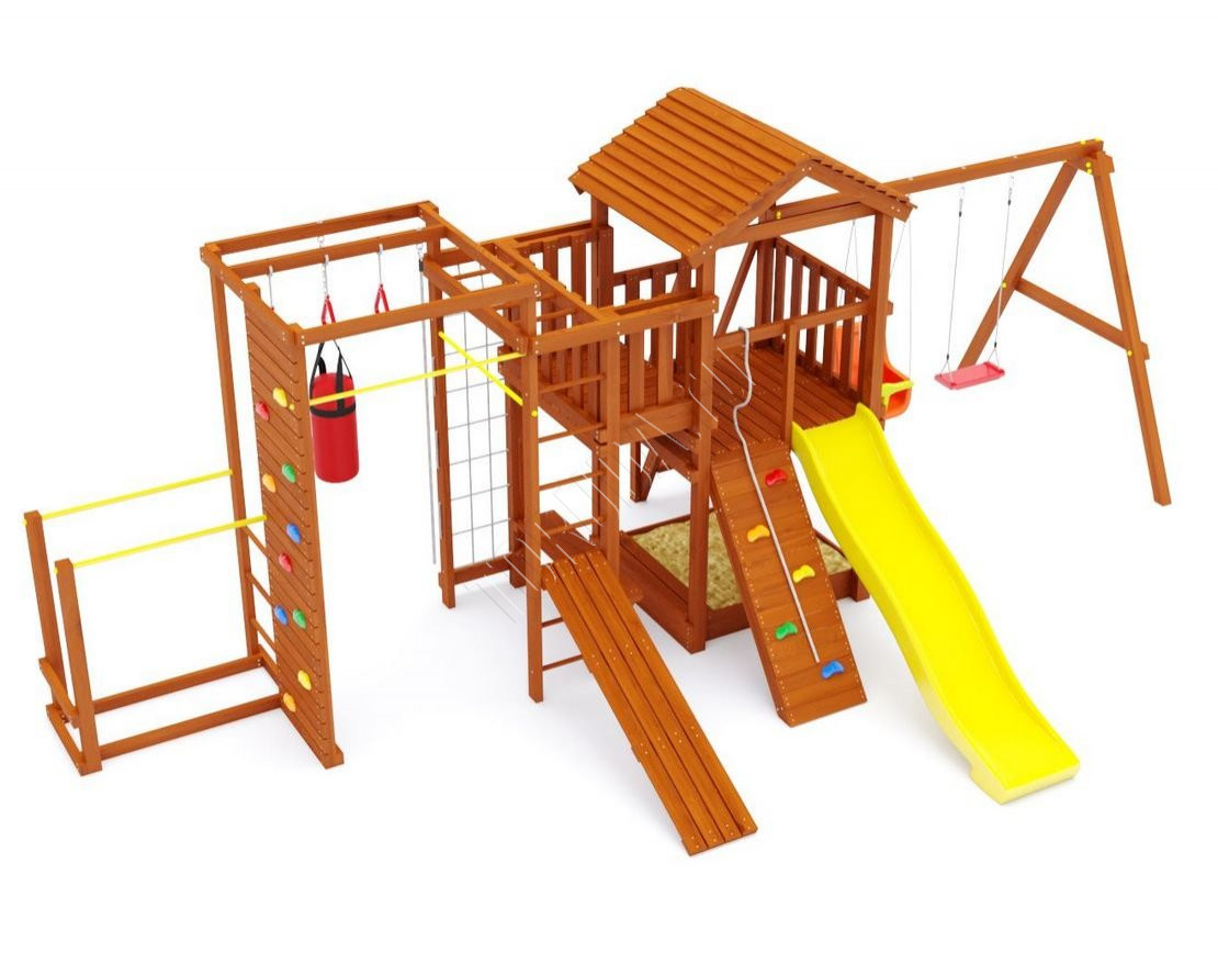 Высокая прочность конструкции и использование материалов высокого качества делают этот комплекс очень долговечным и безопасным. Вся древесина проходит качественную обработку и имеет сертификат безопасности. Металлические детали комплекса усилены, а качельный подвес из оцинкованной стали не будет ржаветь во время эксплуатации. Установленные не снимаемые пластиковые заглушки делают комплекс безопасным и аккуратным внешне.