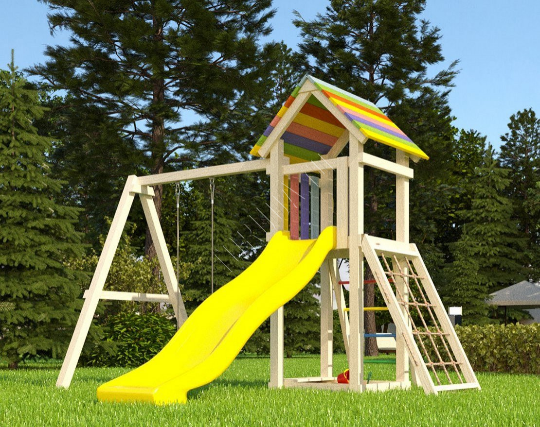- Домик закрыт сверху деревянным перекрытием – оно скрывает от прямых солнечных лучей и позволяет передохнуть на свежем воздухе. Комплекс универсален, поскольку включает в себя столь любимые детьми горку и качели.