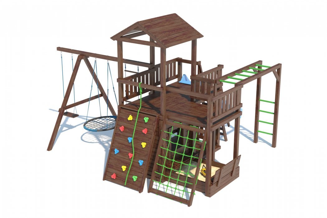 Основа детской игровой - спортивной конструкции - башня с террасой и игровой платформой. Конструкция оснащена двускатной деревянной крышей, встроенным домиком в нижней части конструкции, пристроенной к домику песочницей с крышкой «трансформер», дополнительной платформой в основании конструкции, пластиковым волнообразным скатом с превосходной скользящей поверхностью, деревянной лестницей, широким скалодромом, канатной лестницей, деревянным рукоходом, приставными качелями, сидением качели «гнездо», сидением качели, подвесной лестницей. Для безопасности ребенка предусмотрены перила на лестнице, заборчики и ограждения над зонами препятствий (скалодром, канатная лестница, скат).
