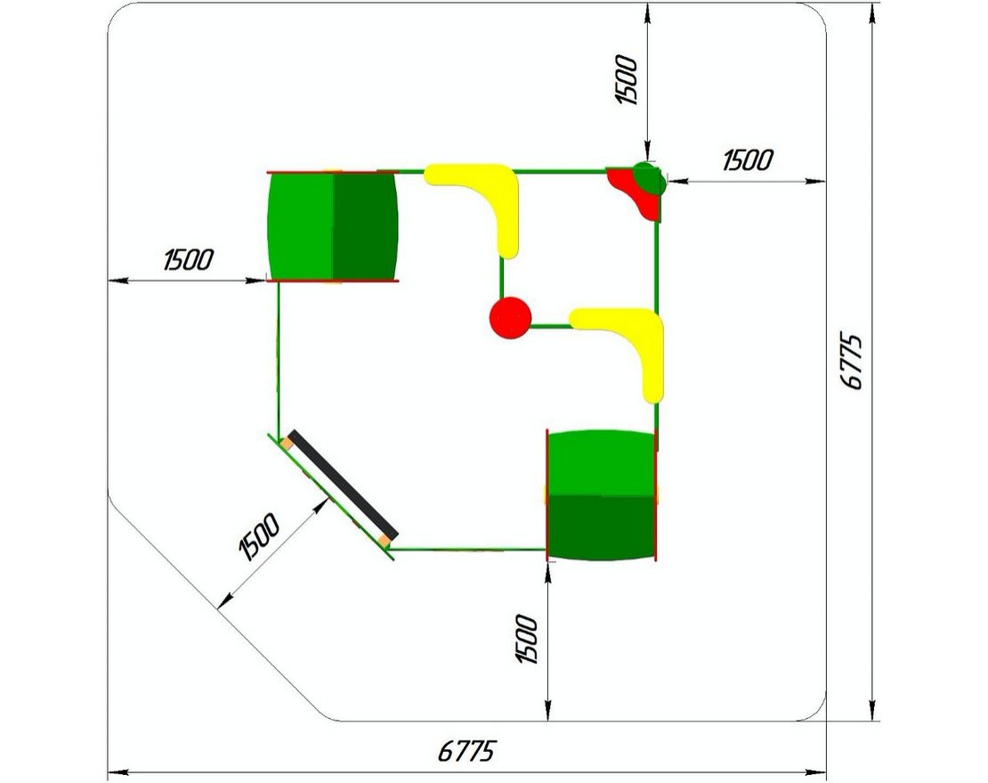 • Занимаемая площадь с учетом зон безопасности и приземления: 6775 × 6775 мм