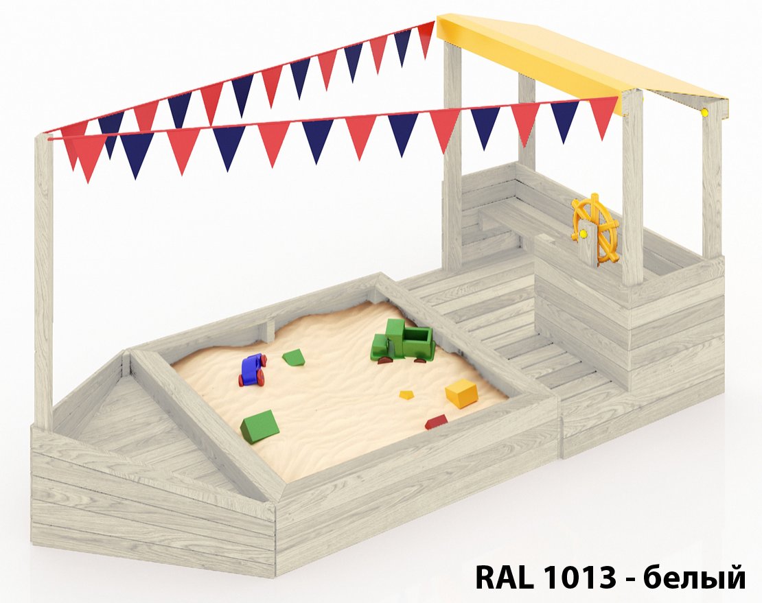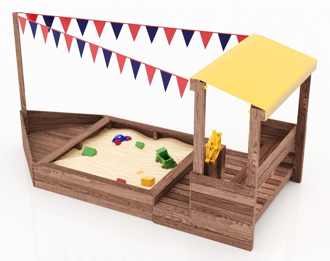 Детская песочница-кораблик и штурманская рубка со штурвалом с тентовой крышей.