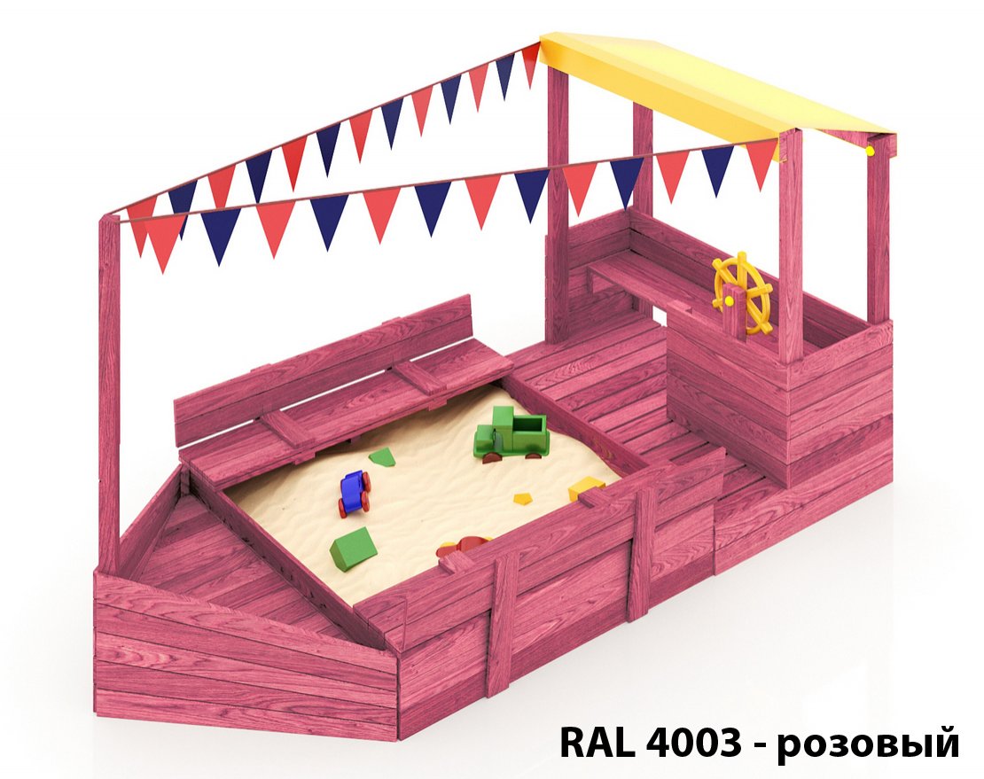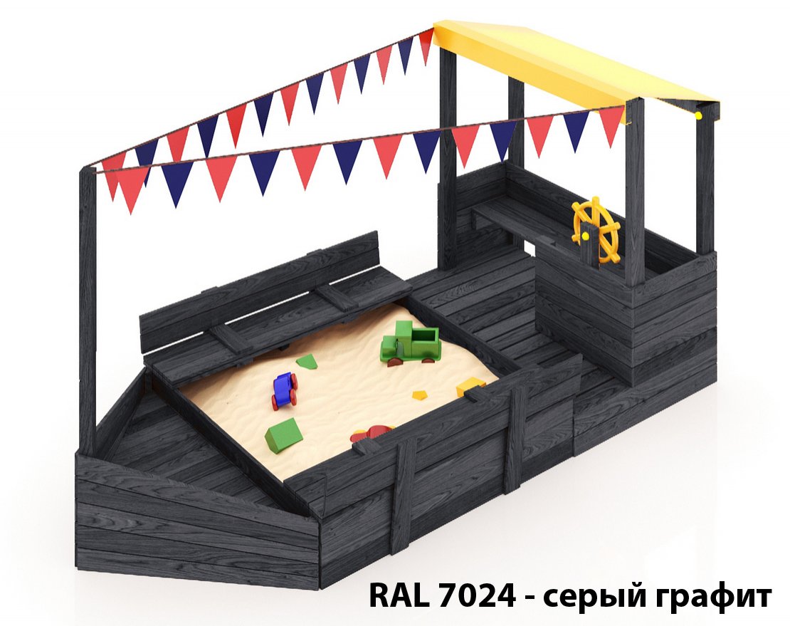 Детская песочница-кораблик и штурманская рубка со штурвалом.
