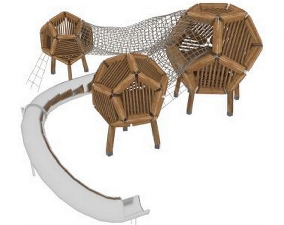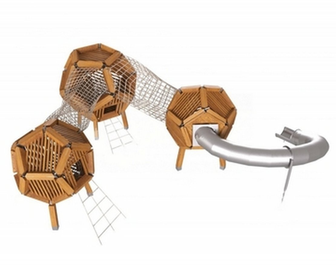 Основные элементы: игровые башни - Д2700 и Д2400, подвесные переходы, тоннельная поворотная горка h2500 мм, гибкие лазательные элементы.