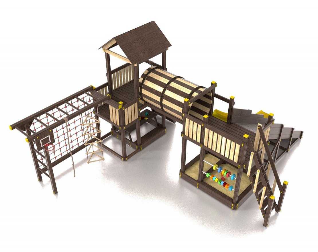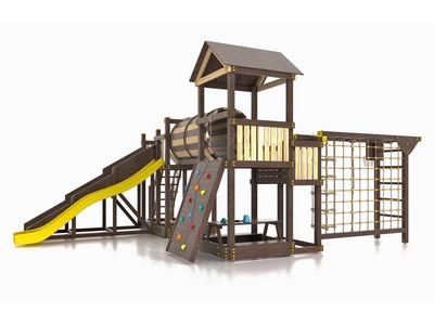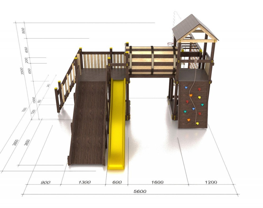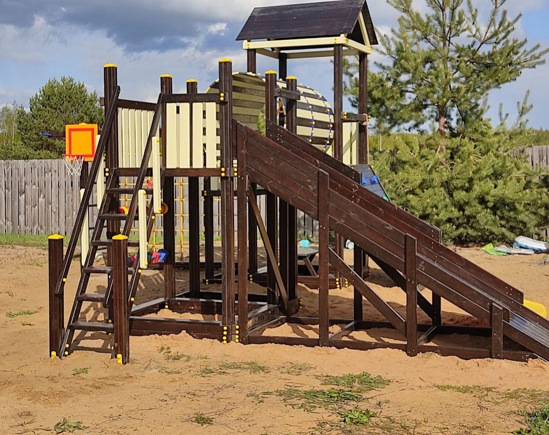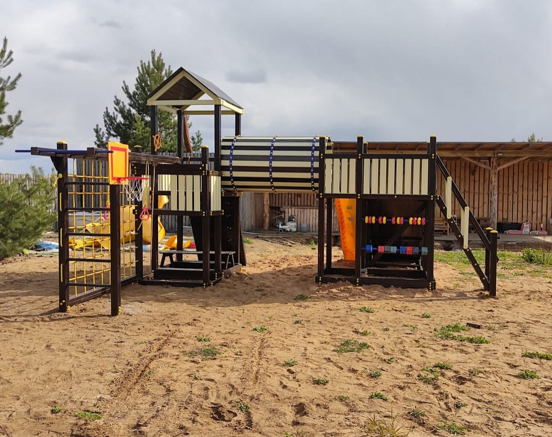 Опоры изготовлены из прочного толстого клееного бруса. Конструкция окрашена безопасной для детей краской на водной основе. Она выполняет сразу две функции. Не выделяет вредных для здоровья ребенка веществ и надежно защищает древесину от деформации и разложения.