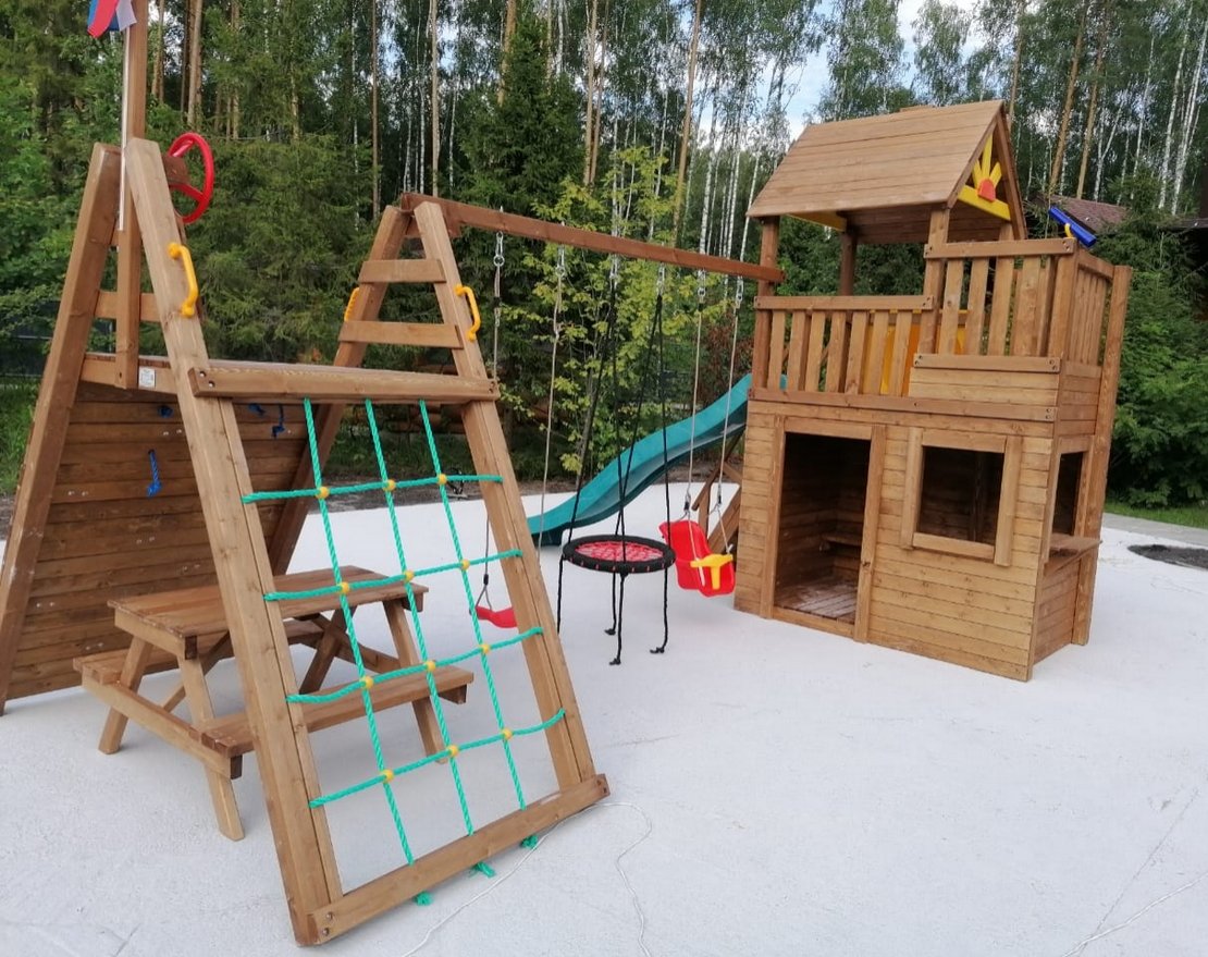 Детская игровая площадка из дерева с покрытием из резиновой крошки - это готовое решение, которое включает в себя различные элементы для развития детей.