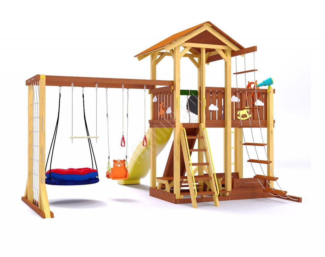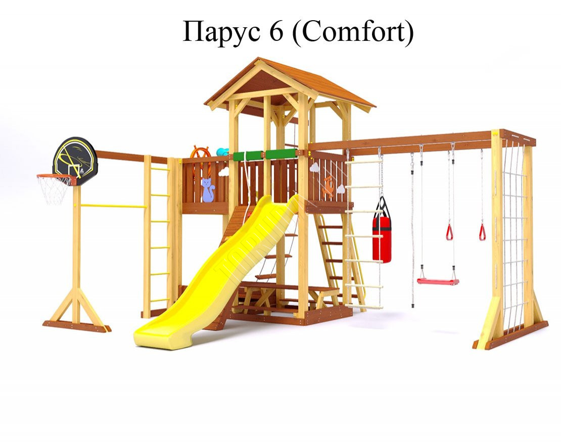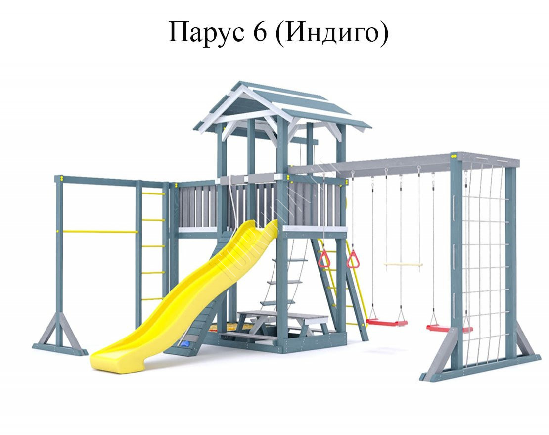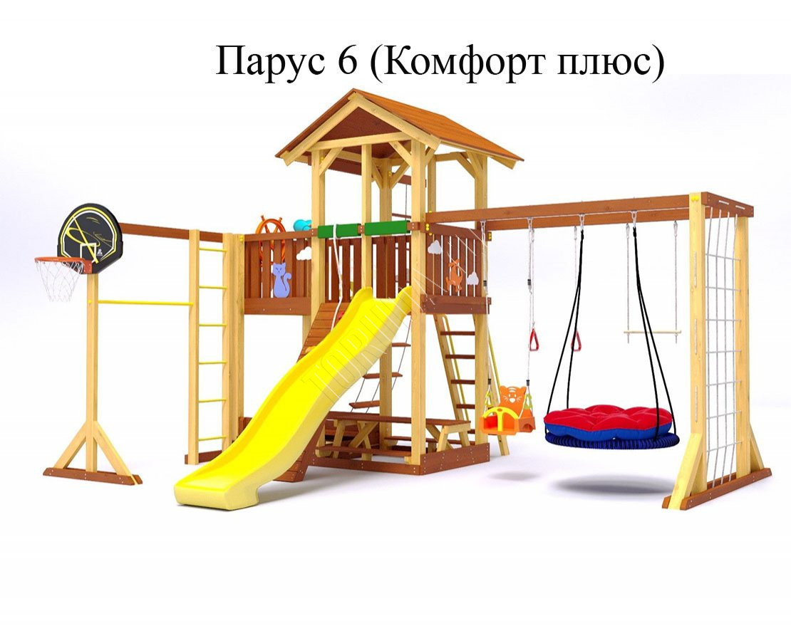 Площадка Парус 6 обладает довольно широким функционалом (который по желанию можно легко расширить). Детская площадка предназначена для дачи, коттеджа.