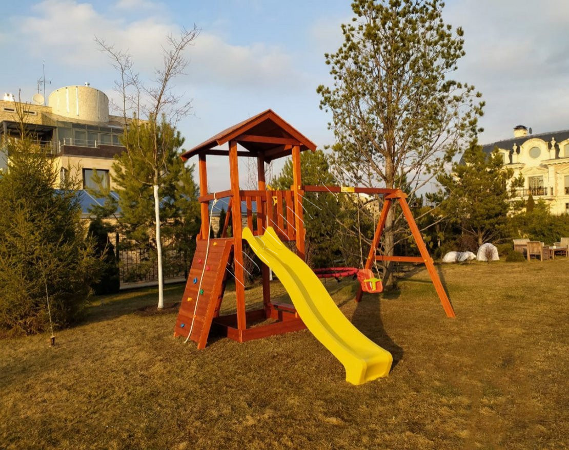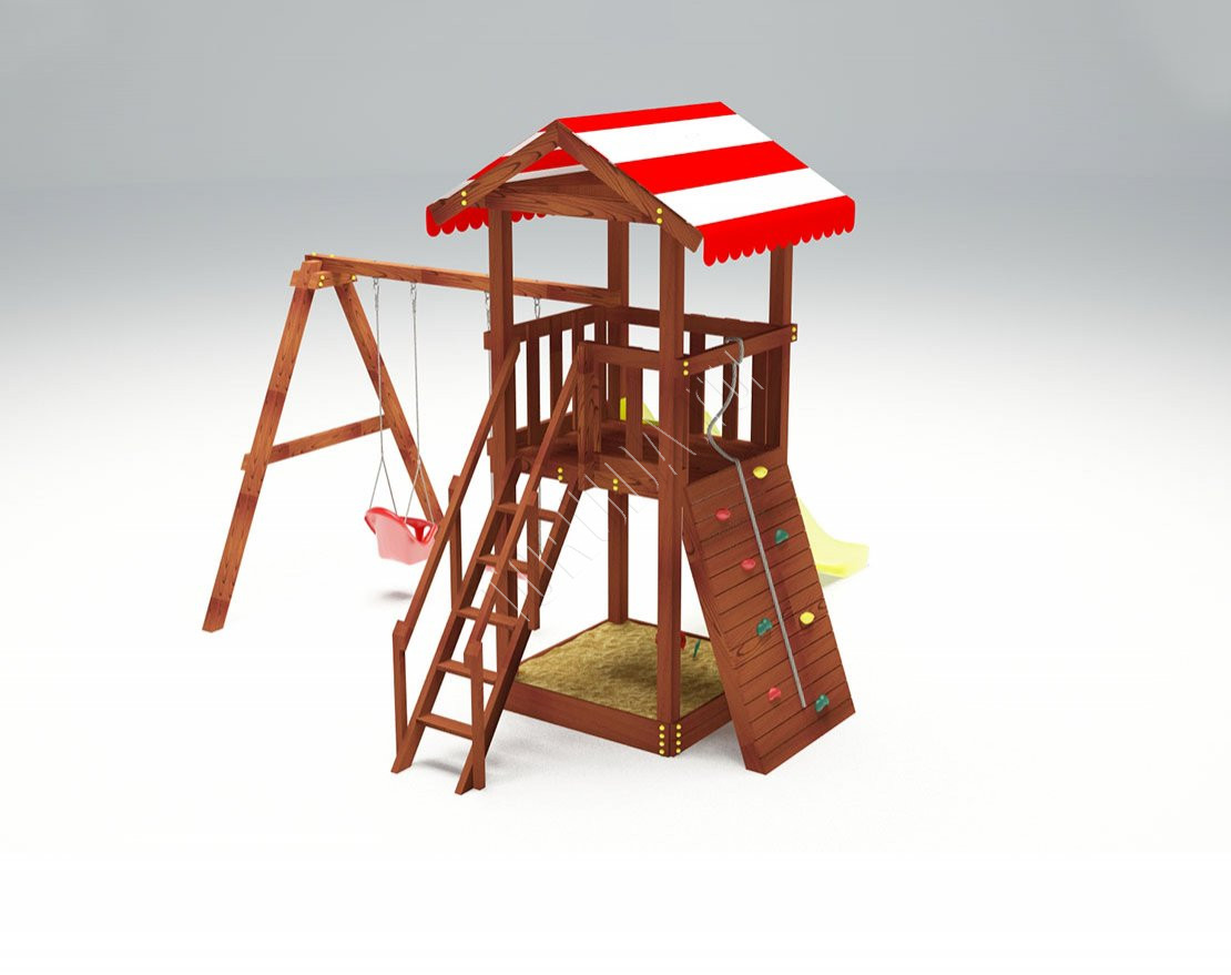 Комплекс имеет небольшие размеры и занимает минимум пространства. Большого выбора игрового оборудования тут нет. Однако это не способ экономии, а скорее формат, концепция позволяющая сделать площадку компактной. Каркас - деревянный. Положительно сказывается на сроке службы применение клееного бруса. Он не меняет форму с годами, не боится сырости или снега.