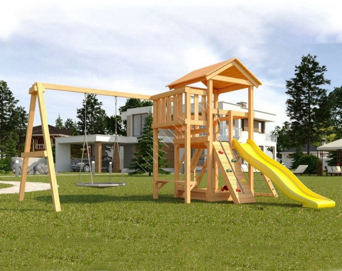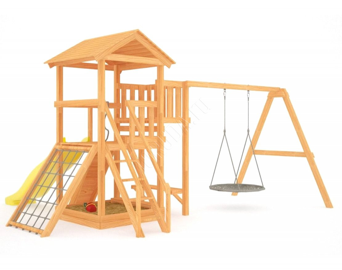 Он безопасен даже для малышей – все крепежи скрыты под заглушками, металлические детали покрыты порошковой краской, а навесное оборудование произведено специально для детей в Бельгии. Основной материал натуральный, балки клееного бруса не выкрашены, края скруглены. Конструкция, качество дерева и подвесные атрибуты соответствуют ГОСТ. Светлая, современная и универсальная площадка удачно расположится в коттеджном посёлке, на территории частного дома или дачного участка.