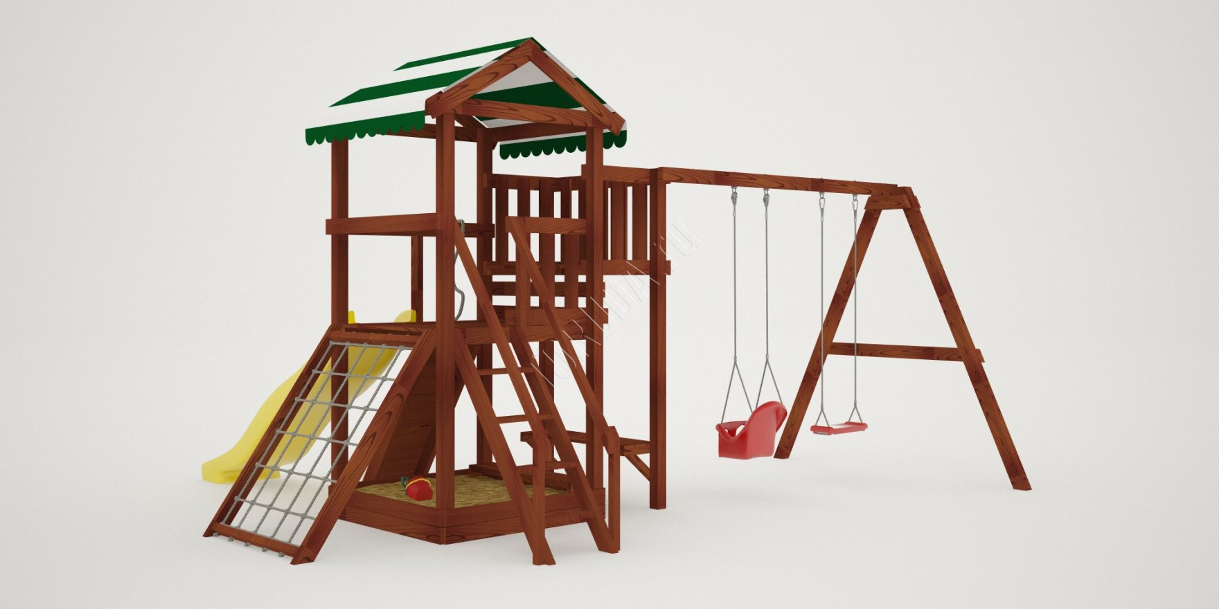 Поднявшись наверх можно поиграть на балкончике, с него будет открываться хороший вид на Ваш дачный участок. А быстро спуститься вниз малышам понравится с горки. Под платформой расположена квадратная песочница со сторонами 129 см, где можно более спокойно провести время, а отдохнуть на деревянной лавочке.