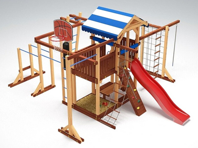 - Ребят постарше заинтересуют: шведская стенка, горизонтальная лестница (рукоход), детские гимнастические кольца, а также металлические параллельные брусья. Для развития мышц рук в модели предусмотрены два турника - детский и взрослый.