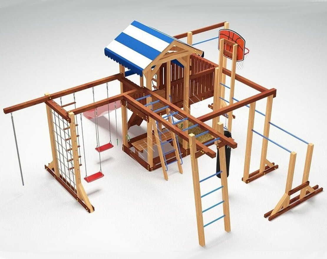 - Детская игровая площадка оснащена настоящим баскетбольным кольцом и подвесной боксёрской грушей.