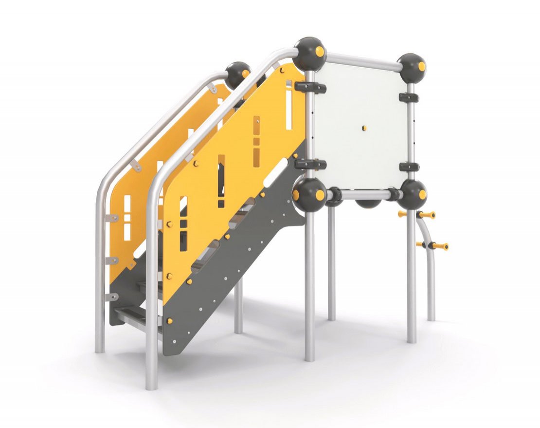 Состоит из металлических опорных стоек, пластиковых панелей, игрового модуля «Часы» и металлической горки с защитными бортиками.