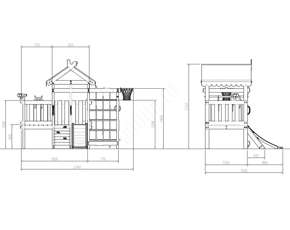 Рама сделана из массива дерева (сечение элементов 45 / 90 мм). Этот материал очень прочный и соответствует ГОСТ. Чтобы защитить его на производстве детали комплекса покрываются лакокрасочным покрытием в два слоя.